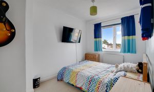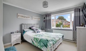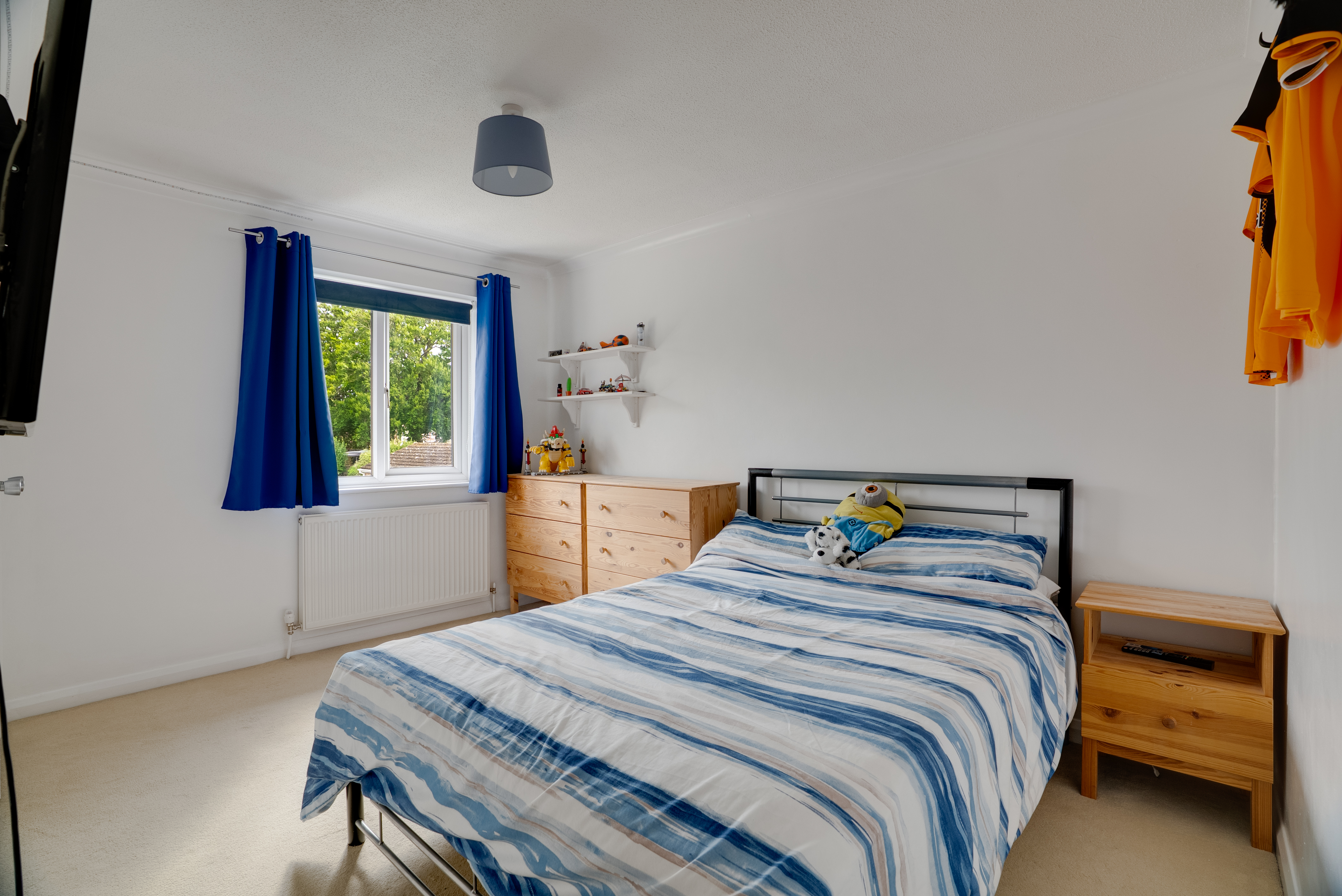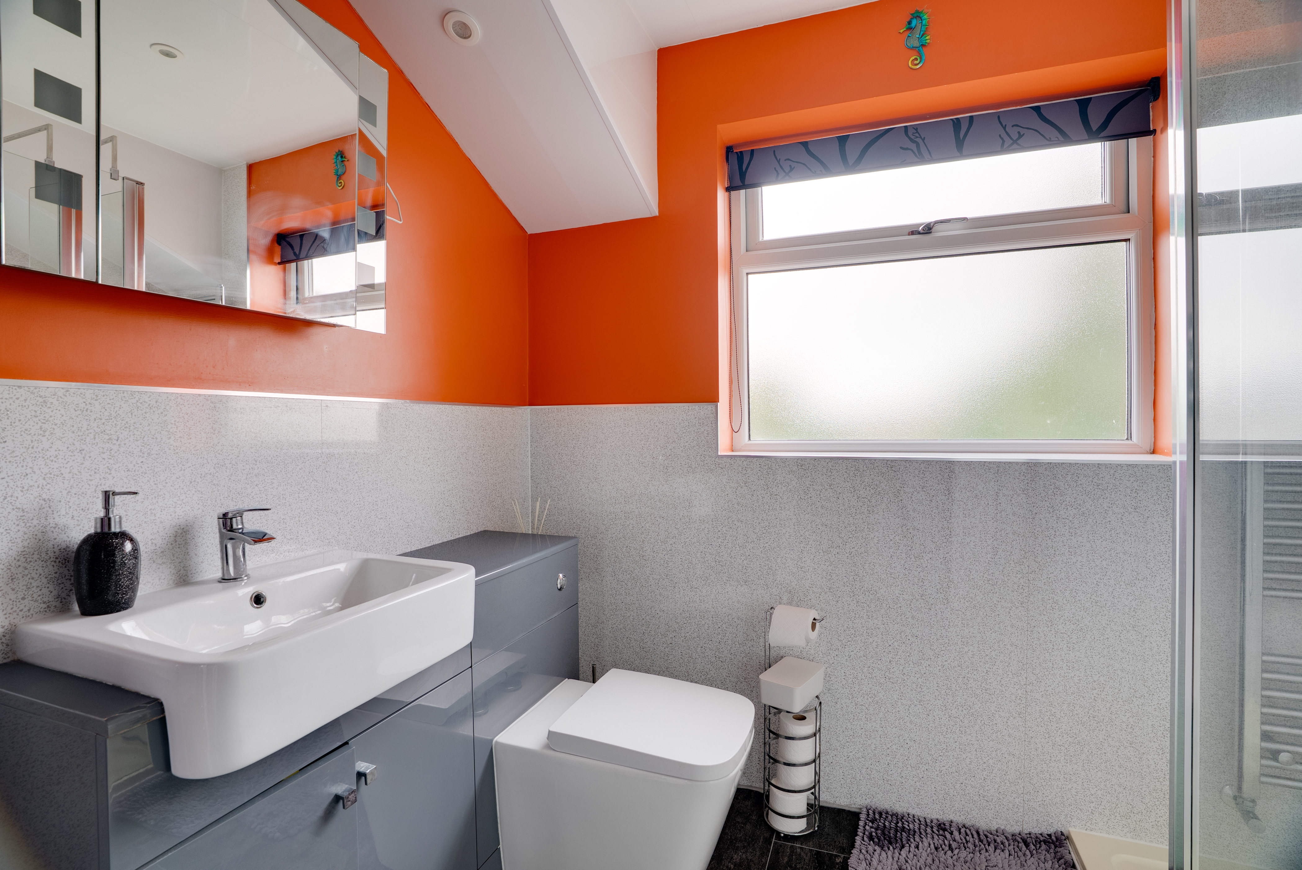 Upstairs, four bedrooms provide flexible accommodation for families or home working, with built-in storage included in three of the rooms. The modern family bathroom has been recently refitted and includes a walk-in shower, wash basin, and WC, offering a sleek and practical finish.