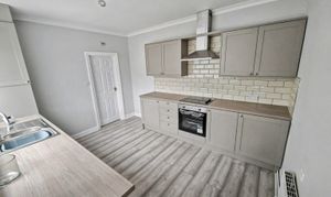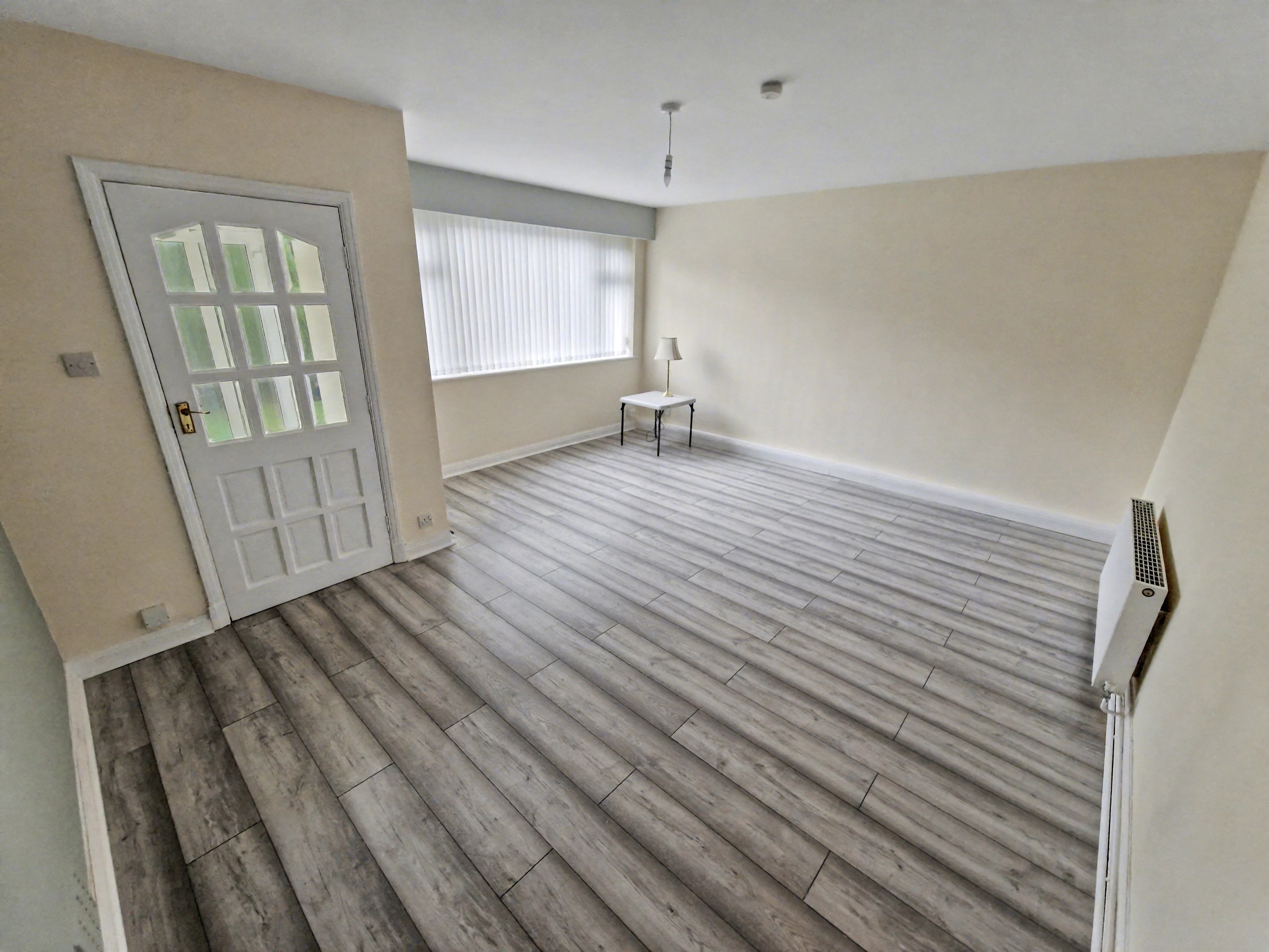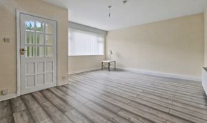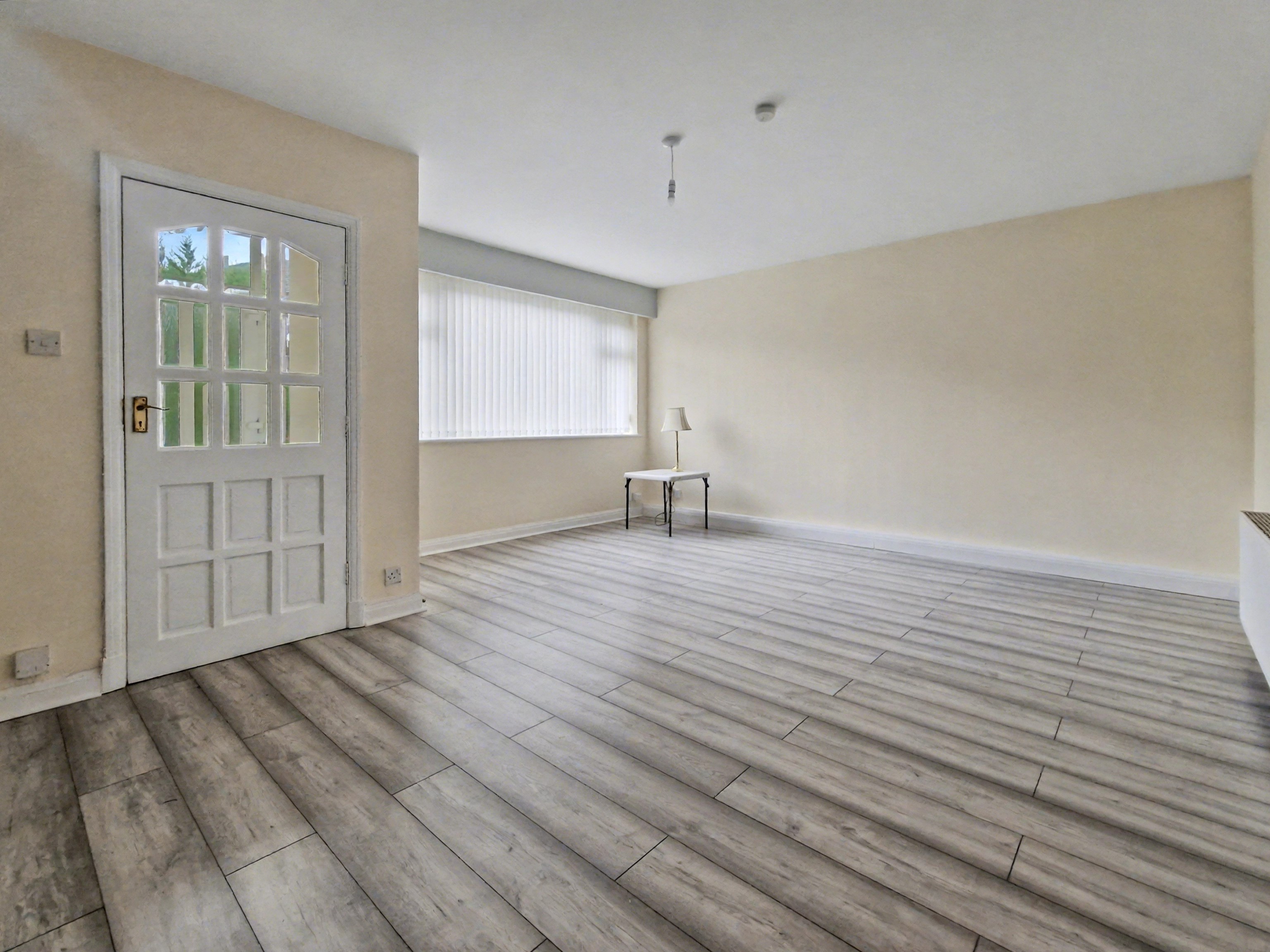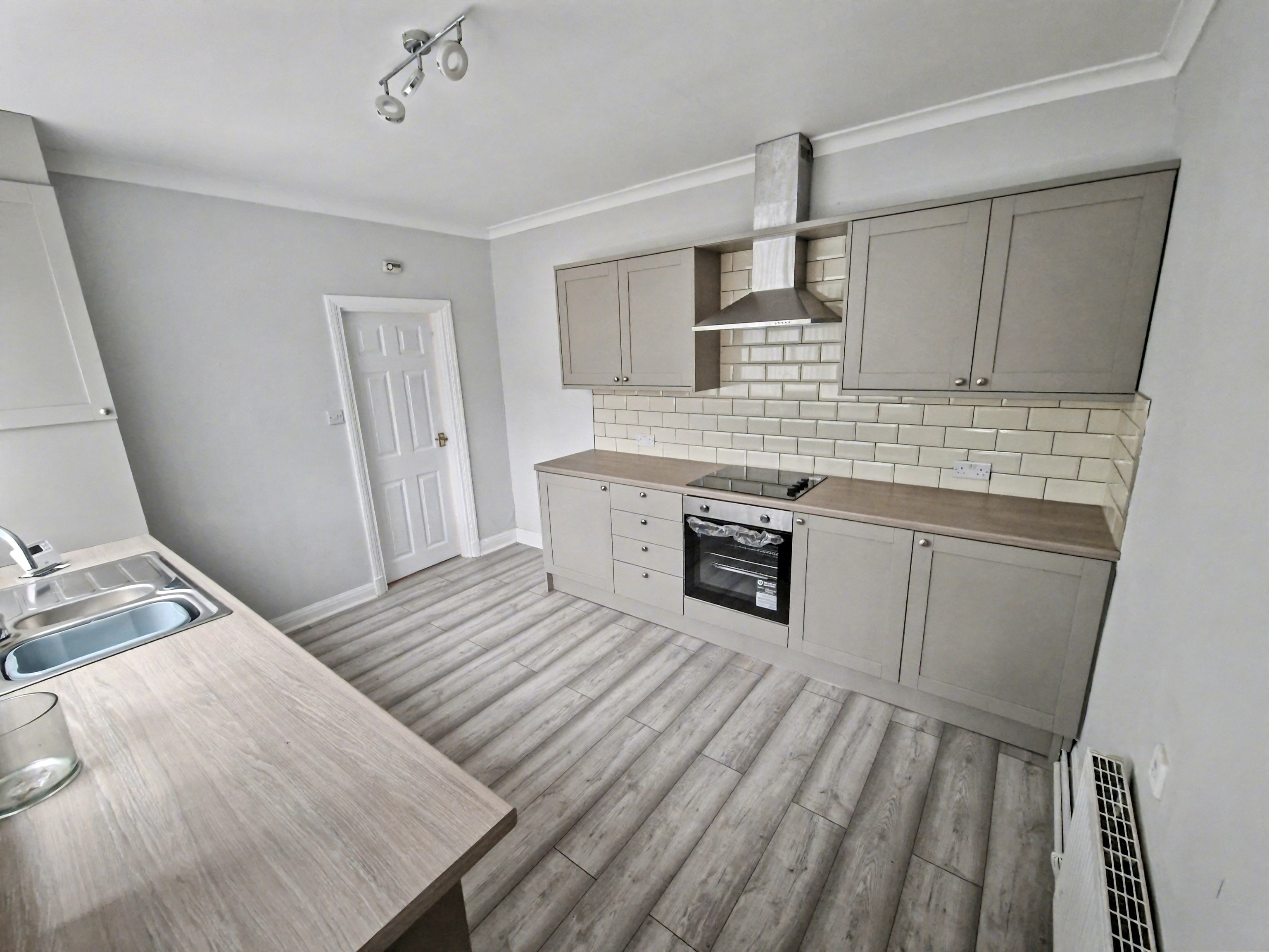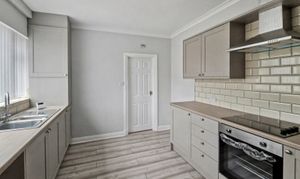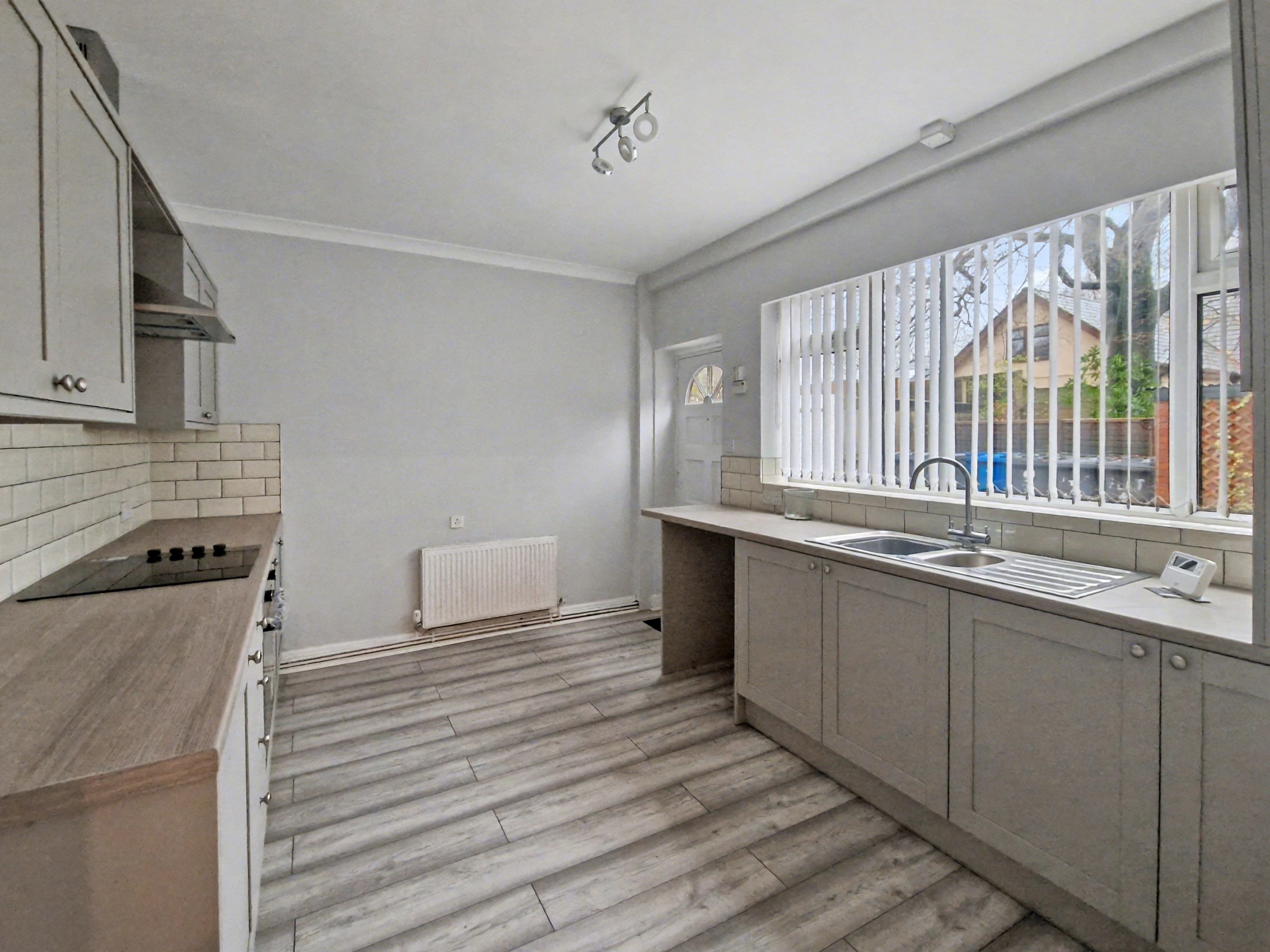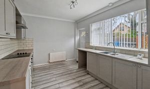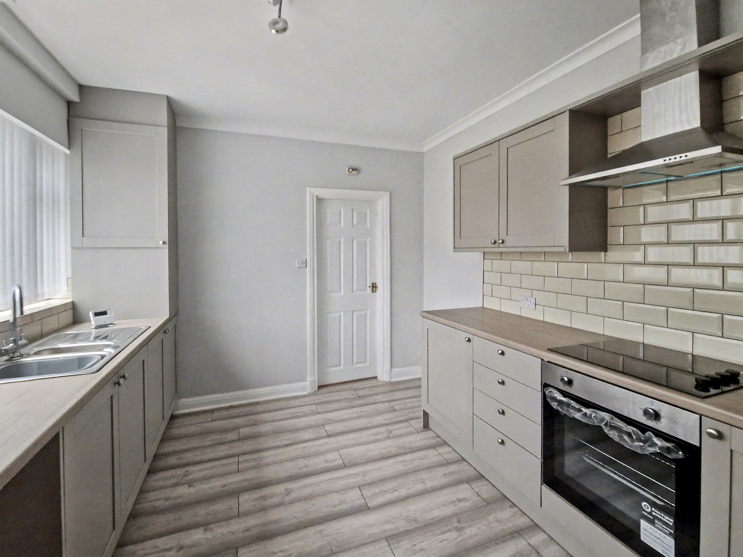 The property features a spacious entrance porch that opens into a bright and generously sized lounge and dining area, with large windows overlooking the communal front gardens. From here, a hallway leads through to a recently renovated kitchen, fitted to a modern standard with grey units, cream splashback tiles, a brand-new oven and hob, and space for both a washing machine and fridge-freezer. A wood back door provides convenient access to both the front and rear of the property.
