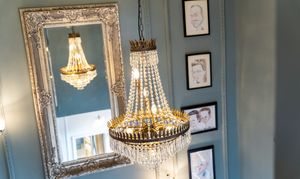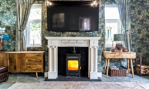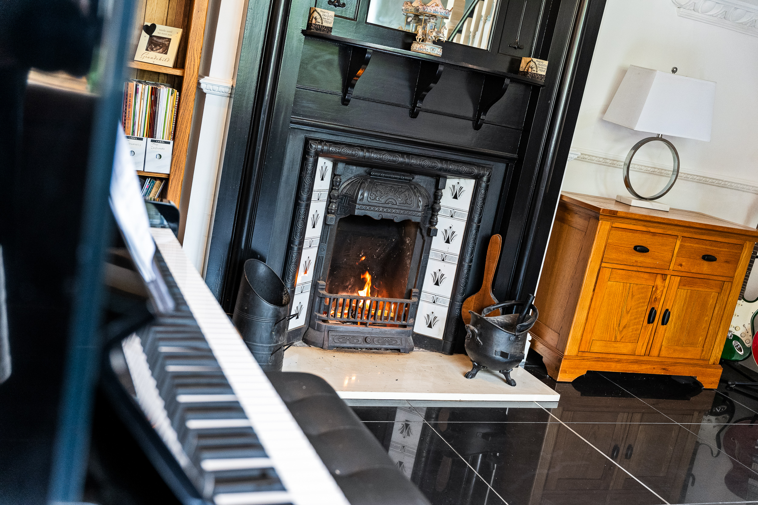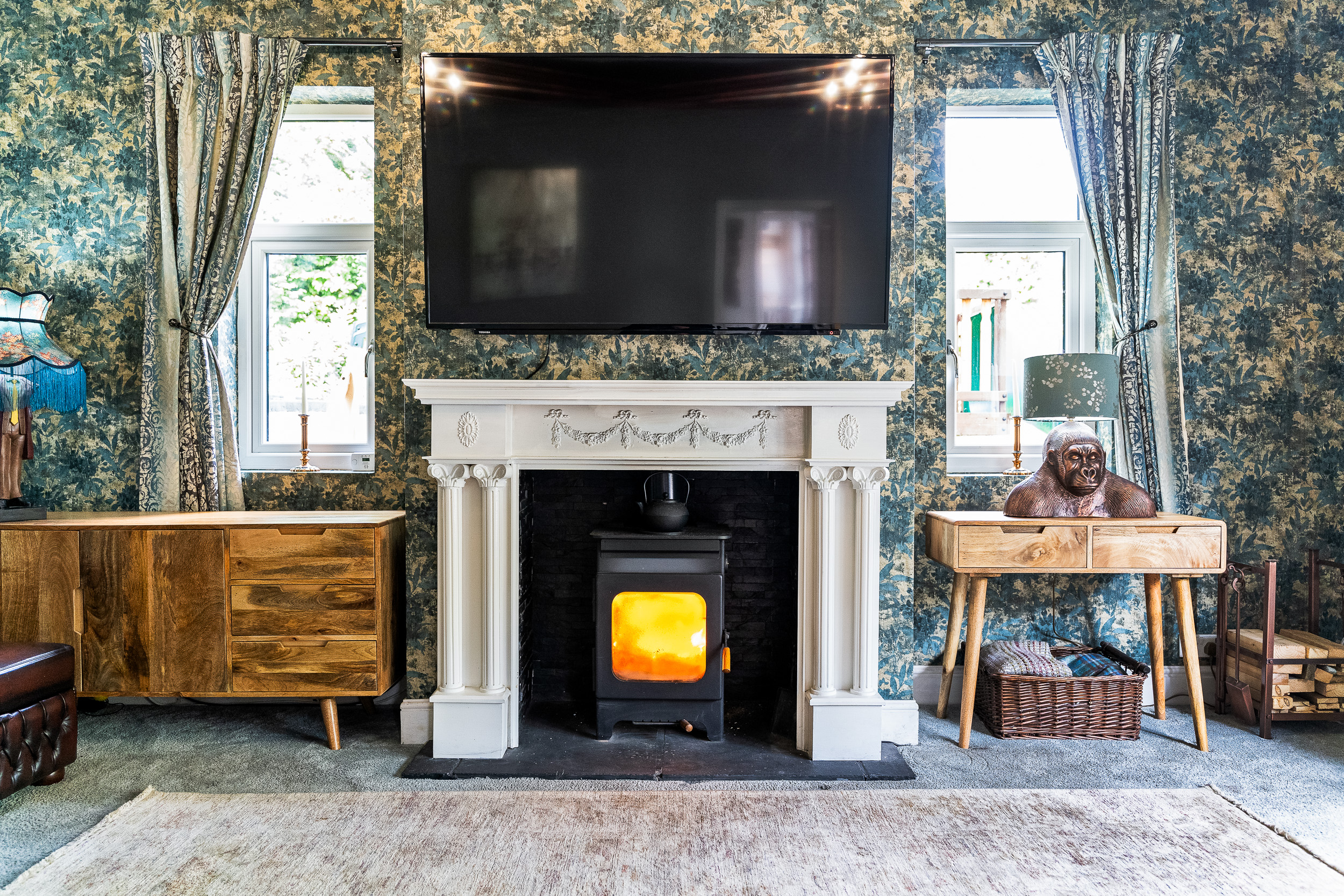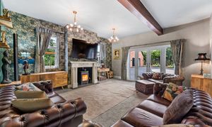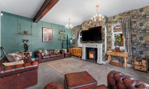 Turning right from the hall, a passage with a spacious walk-in storage cupboard leads into a beautifully characterful living room. Dual-aspect windows and French doors flood the space with natural light, highlighting the period panelling painted in a soft green that softens the vintage floral wallpaper. An ornate column mantelpiece frames the efficient multi-fuel Burley log burner, creating a cosy focal point for cooler evenings. A beam across the ceiling, period-style hoop chandeliers, and wooden shelving add further charm, while a thick neutral carpet grounds the room in comfort.