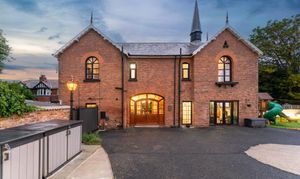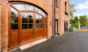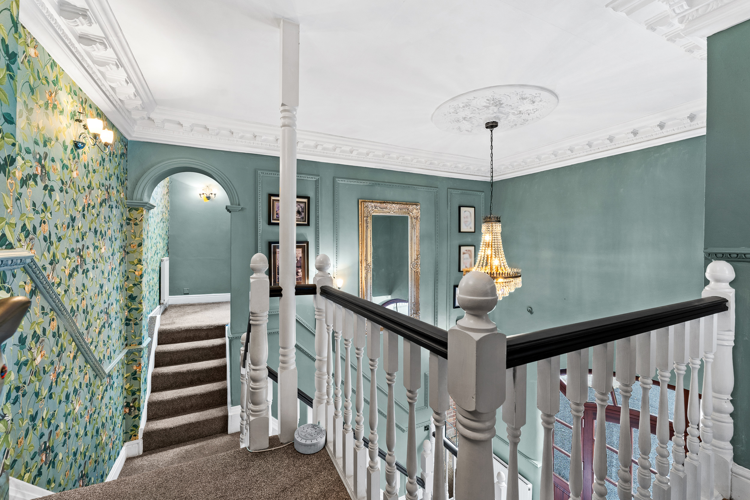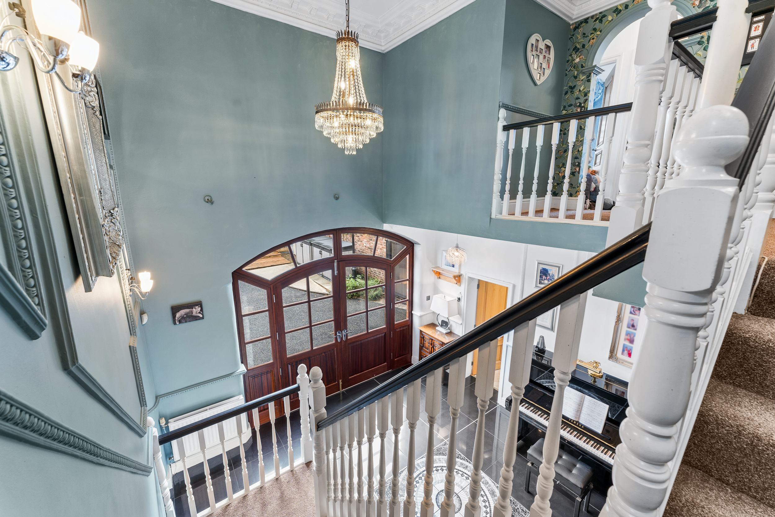 Installed in 2020, this impressive arched redwood entrance is positioned to enhance the symmetry of the exterior, inviting you into a grand entrance hallway filled with drama. Here, decorative wall panelling meets a statement staircase and a double-height ceiling finished in elegant cornicing, created by the same company that crafted the mouldings for the Manchester Opera House.