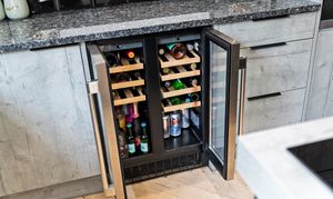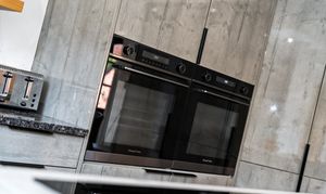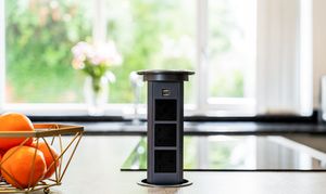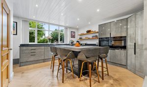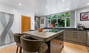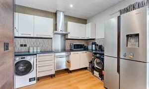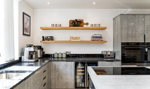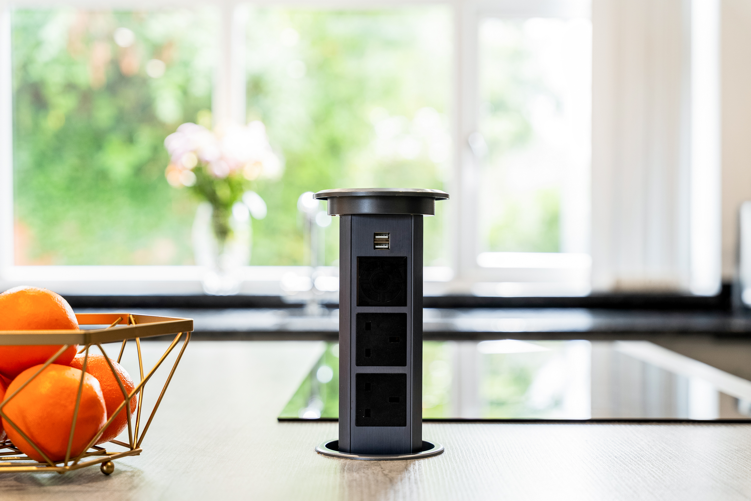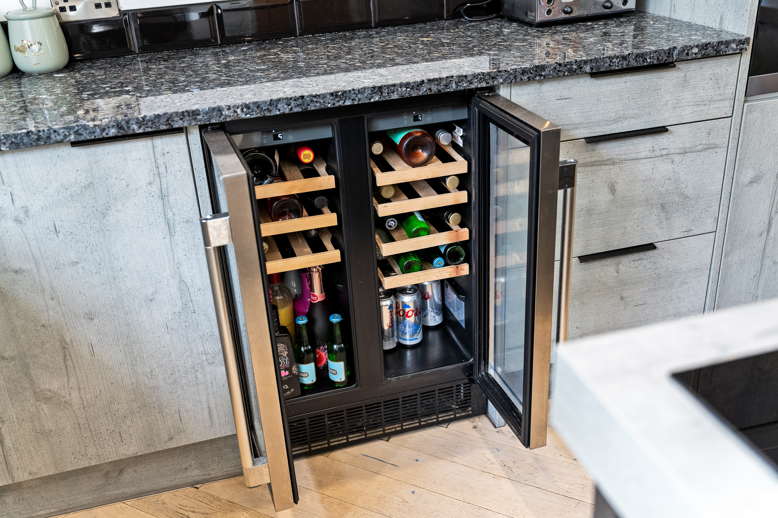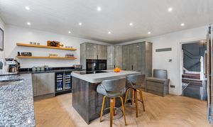 An island breakfast bar takes centre stage, fitted with a five-ring induction hob and an ingenious automated pop-up plug socket complete with Bluetooth connectivity and phone charging. Integrated appliances include a tall fridge and freezer, a Russell Hobbs oven and microwave oven, a dishwasher, and a wine fridge.