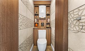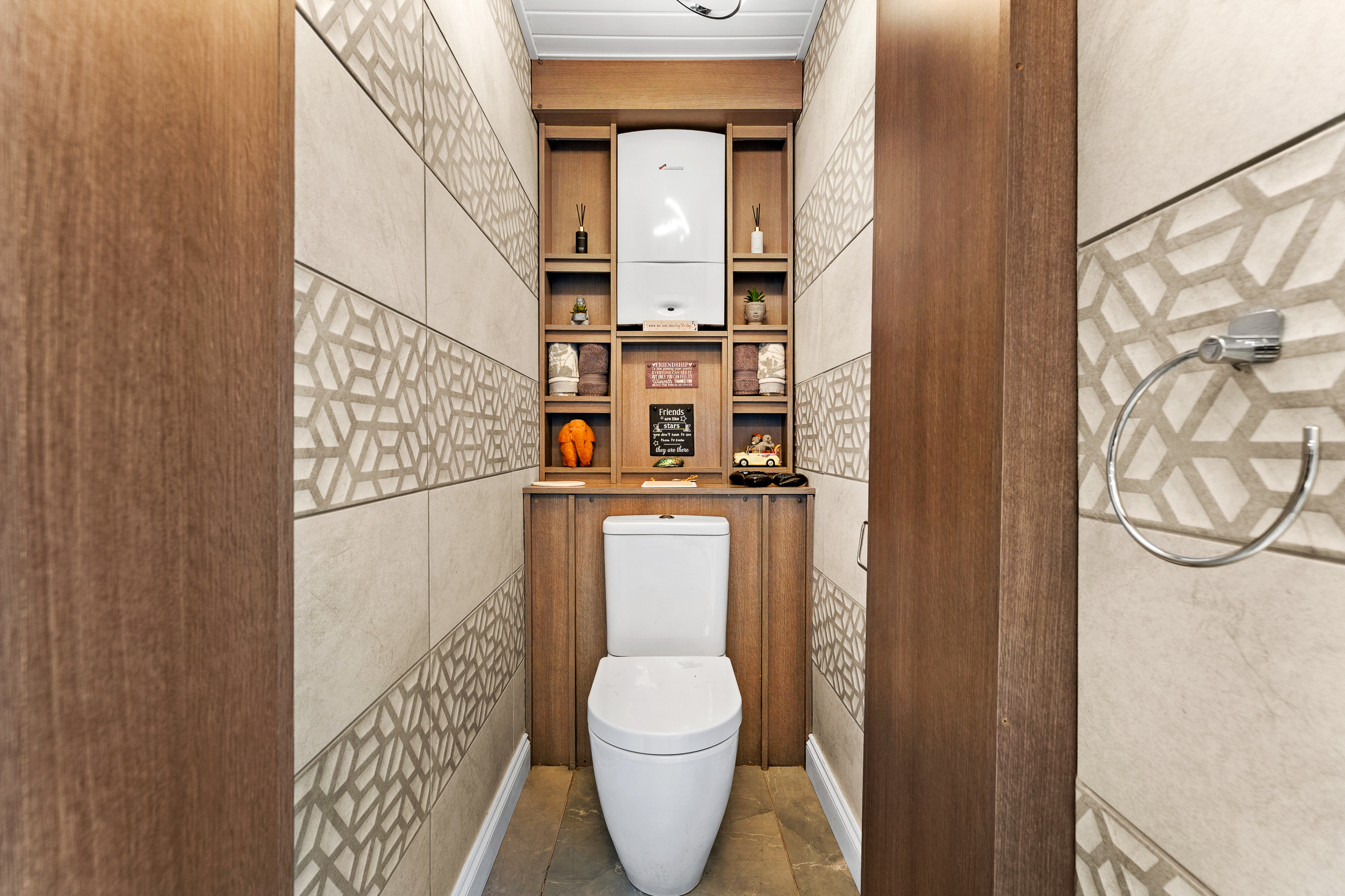 You’ll also find a large larder cupboard and a sink that features a boiling water tap for added convenience. A dedicated utility space is discreetly incorporated for laundry appliances, ensuring that practicality does not interrupt the room’s flow. From here, a door leads into a stylish adjoining cloakroom, lined with stone-effect tiles and finished with modern sanitaryware, a fitted wooden storage unit housing the boiler, and a mirrored cabinet above the basin.