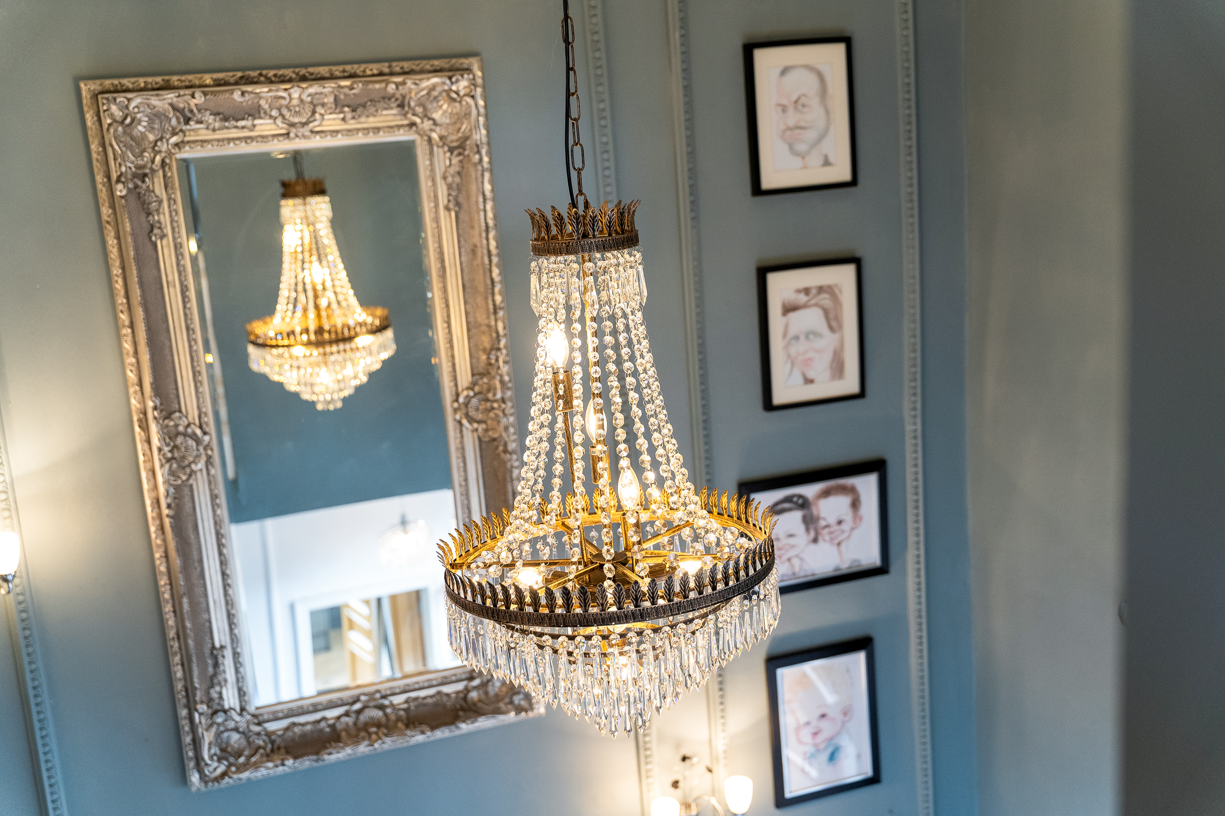 Rich-toned walls contrast with crisp white paintwork, while the glossy black floor tiles, featuring a central mosaic pattern, reflect the abundance of light from the windows and rose-crowned chandeliers. Centrally placed, the working period fireplace adds an inviting flourish to this incredible reception space, which often frames a huge Christmas tree during the festive period.
