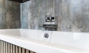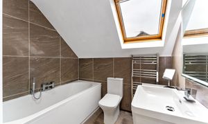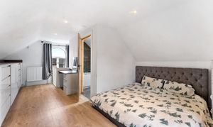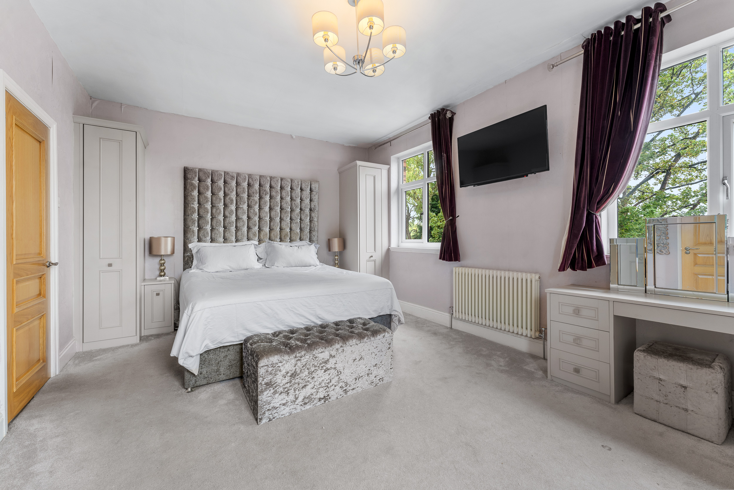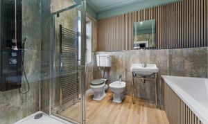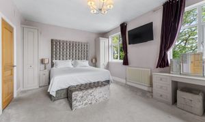 Head there now to admire its generous proportions. Plushly carpeted, it’s lit by large dual-aspect windows and a central chandelier-style pendant. Hammonds fitted wardrobes provide ample storage and match the built-in dressing table and bedside cabinets. In the full-size en suite, slat panelling and stone-effect tiles backdrop a luxury double-ended bath with a waterfall tap. The walk-in shower features a rainfall head, body jets, and a hand-held shower. A vertical heated towel rail, low-level lavatory, period-style basin with an LED mirror above, and a bidet add a heritage flourish to the contemporary design.