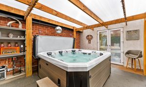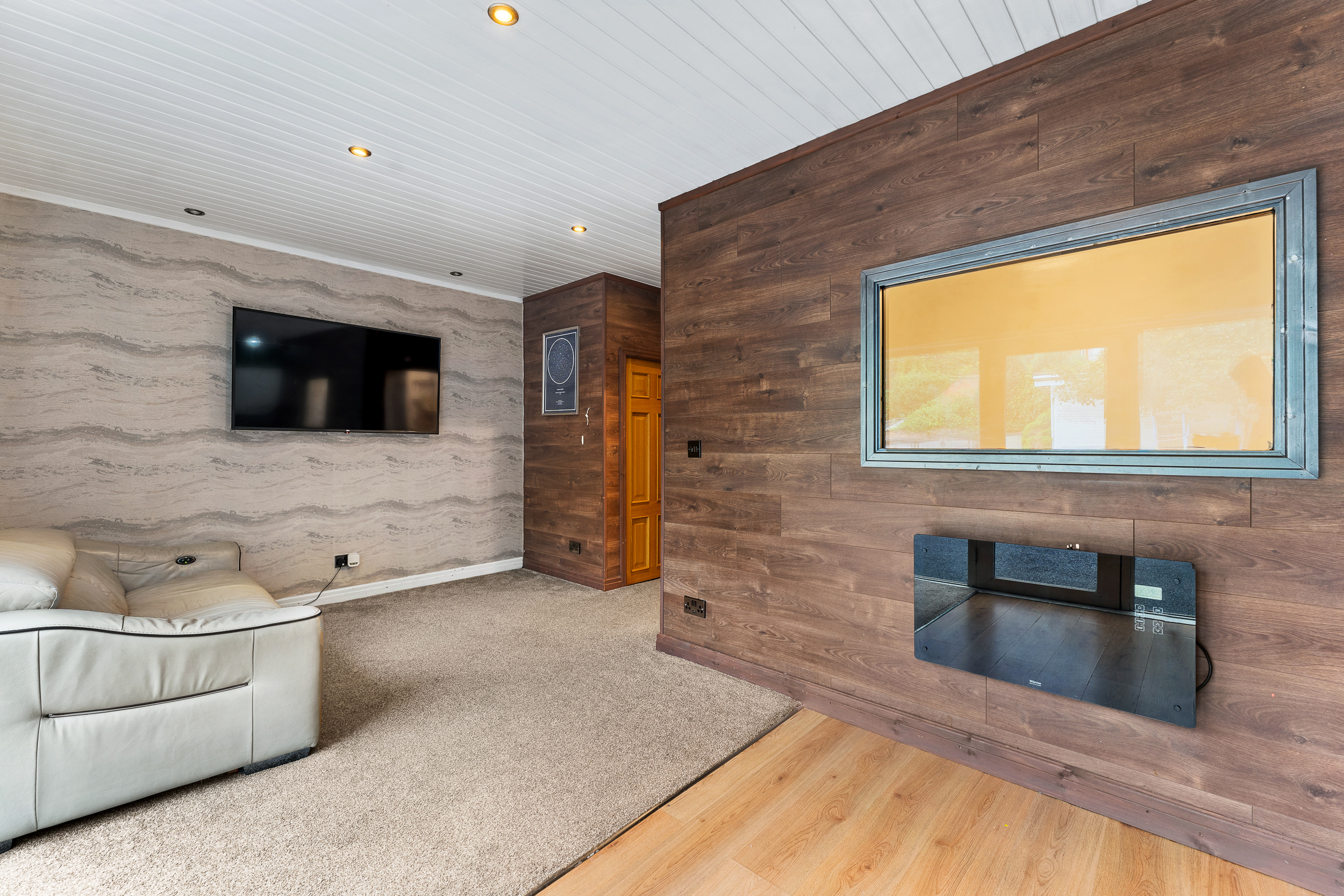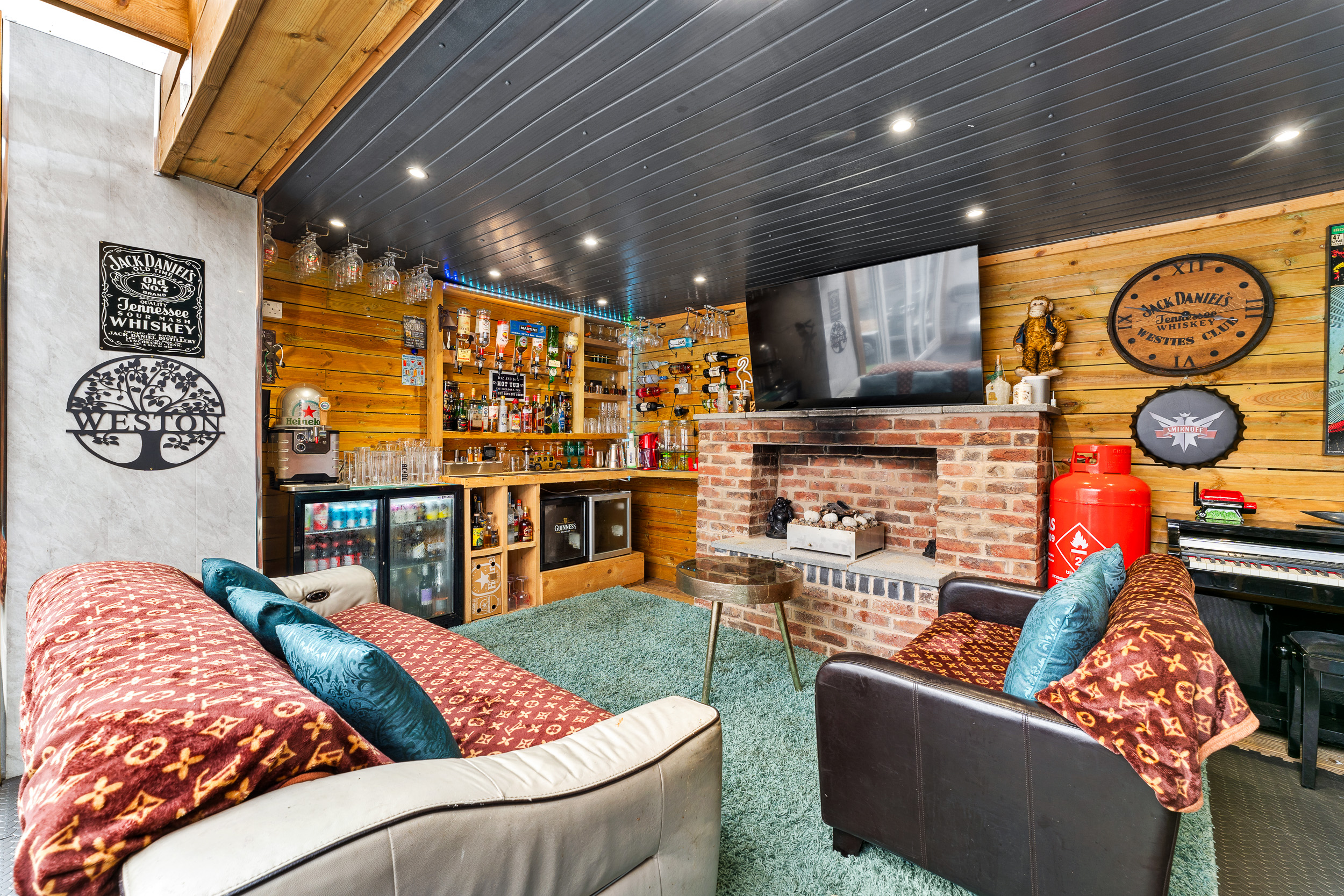 Sliding side doors from the garden and French doors to the front open to a key highlight of the house: a fabulous, spot-lit entertainment suite boasting a bar, a brick-built fireplace with a TV above, and a seven-seater hot tub. Where better to kick back and watch the game, enjoy romantic evenings, or host family and friends for drinks and amazing parties? There’s even a steam shower in the adjoining shower room to freshen up after a dip.
