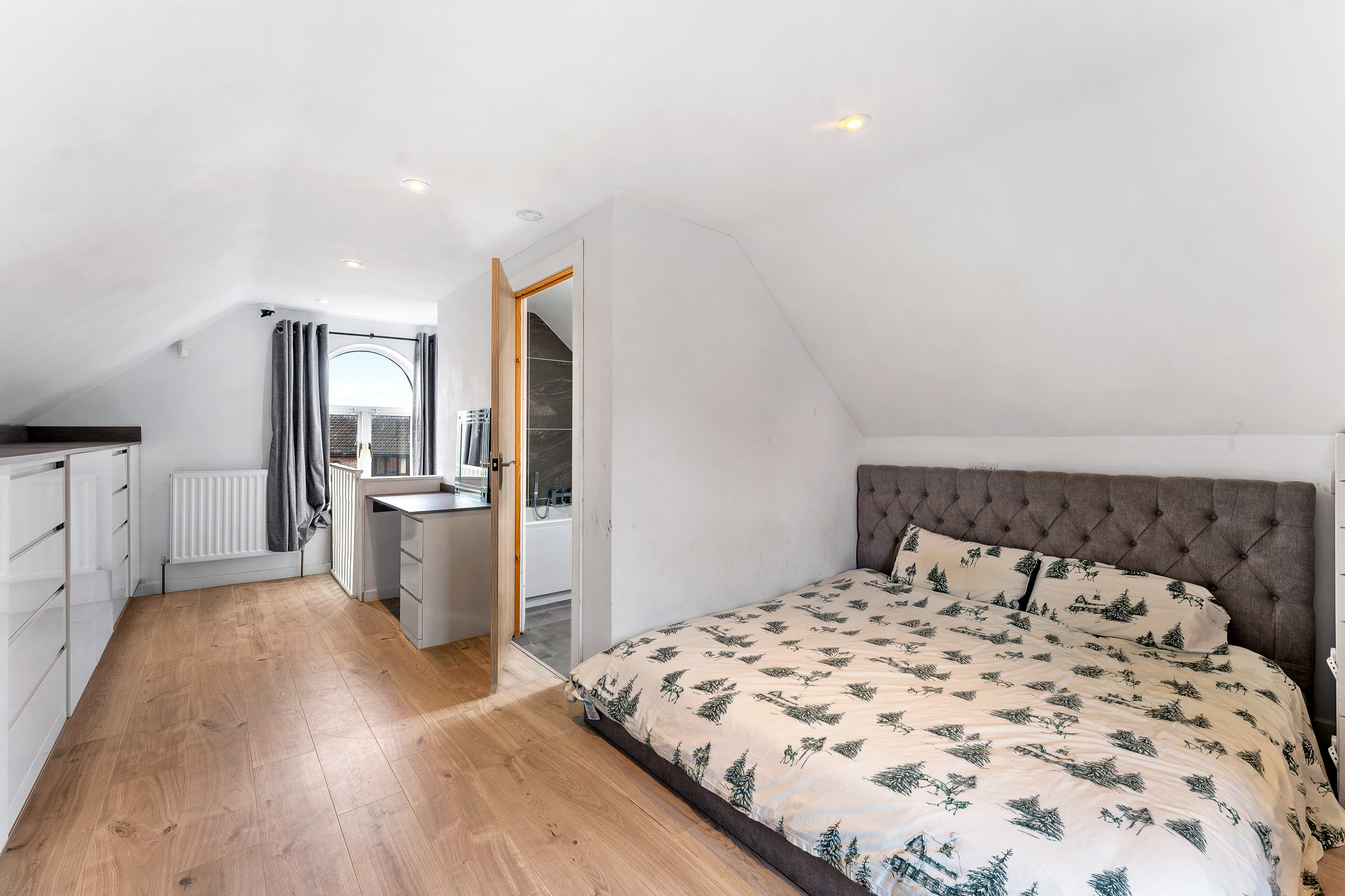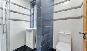You’ll also find a separate carpeted playroom or snug, in-built storage, and a modern shower room downstairs. Upstairs, dual-aspect windows and recessed downlighters brighten the double bedroom, which is fitted with storage and a dressing table. Warmed by a heated towel rail, the adjoining en suite features a double-ended bath with a shower attachment and stylish tiling and sanitaryware.