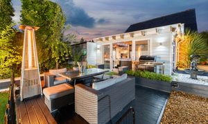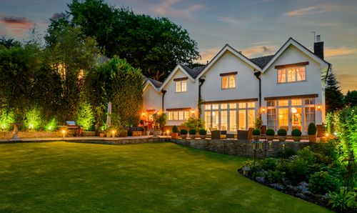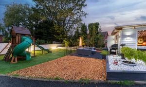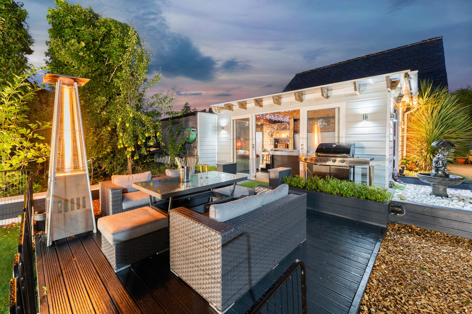 Sliding doors from the entertainment suite open straight onto a grey decked seating area, blurring the line between indoors and out. With the hot tub, bar, and lounge just steps away, the garden becomes an extension of the entertaining space – perfect for hosting summer parties, al fresco dining, or simply enjoying a drink as the sun sets. Gravelled areas and matching raised borders filled with white pebbles bring a contemporary edge, while exterior lighting and a pyramid heater ensure the space can be enjoyed long into the evening.