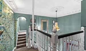 On the first floor, calming Graham & Brown’s ‘Lock and Key’ accent wallpaper graces the split-level landing, which features charming archways, coved ceilings, thick carpeting, and a sweeping view over the hallway. Beyond, you’ll discover three double bedrooms, with the primary suite enjoying privacy away from the rest of the household.