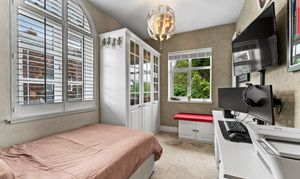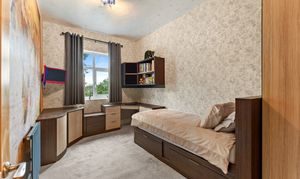 Bedrooms two and three lie on the other side of the landing. They are both carpeted and fitted with Hammonds furniture, while the third double features a dramatic arched window with bespoke wooden shutters. Both rooms share a fully tiled three-piece shower room with a rainfall enclosure and a modern finish.