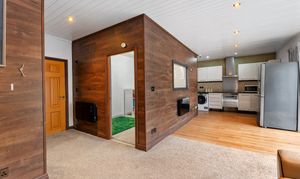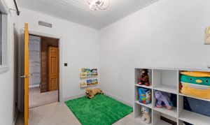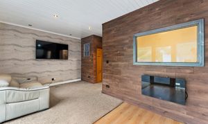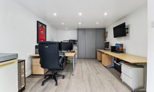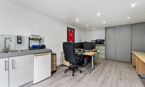 Tucked away in the corner of the driveway next to a useful outdoor storage area lies a peaceful office – ideal for running a business from home. Lit by ceiling spots and lined with practical laminate, it has room for several workstations, served by a functional kitchenette with a sink, boiling water tap, and space for a fridge. The office also features built-in storage with sliding doors and a lavatory, making it ideal for remote working or repurposing as a gym or studio.