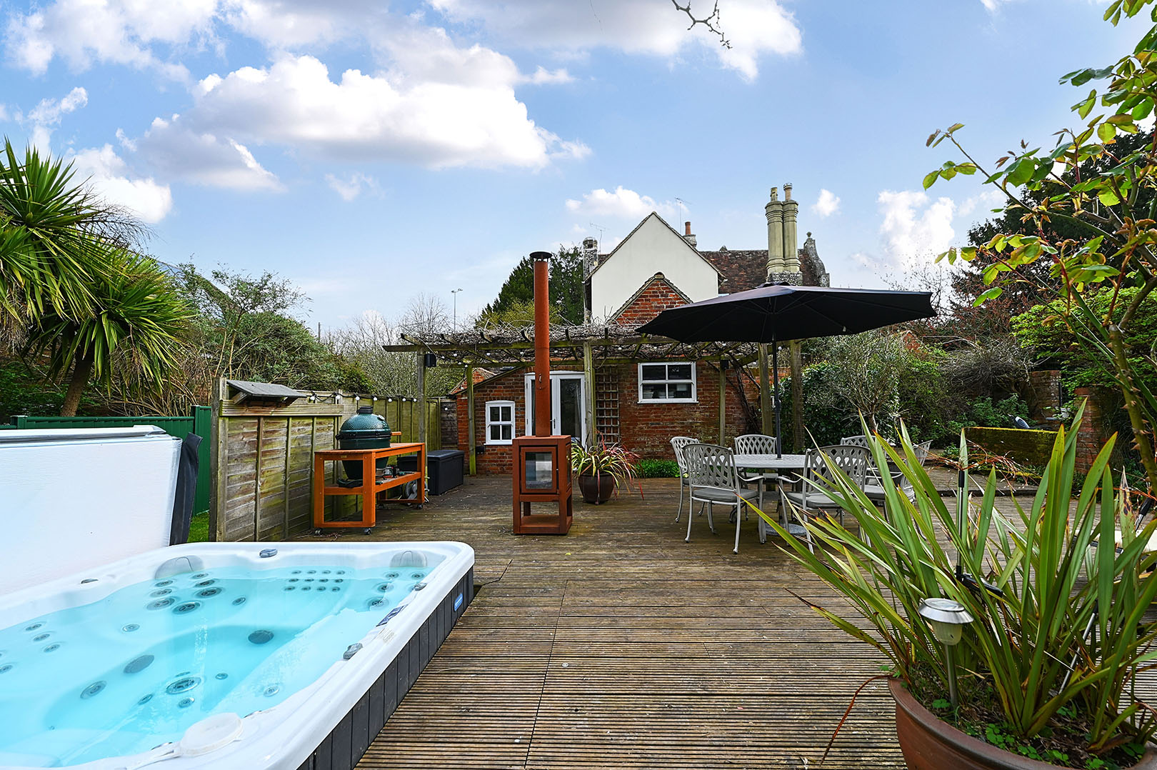 The gardens are as impressive as the interior, providing both privacy and a tranquil setting. Stone House is approached via an attractive wrought iron gate, leading to a front garden mainly laid to lawn and bordered by mature flowers and shrubs. Two gates open onto a private courtyard, which in turn leads to a generous decking area complete with a pergola and hot tub—ideal for alfresco dining, entertaining, or relaxation.
