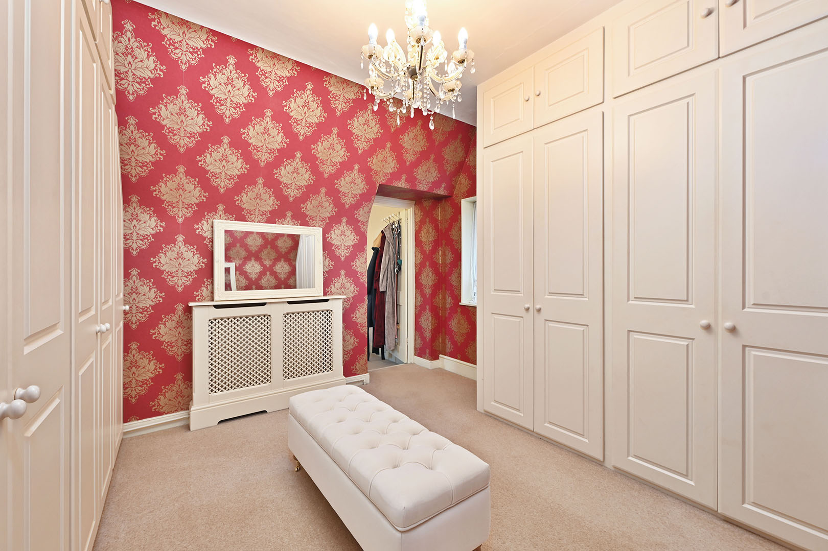 Carpeted with window to side and range of built in wardrobes and storage cupboards.