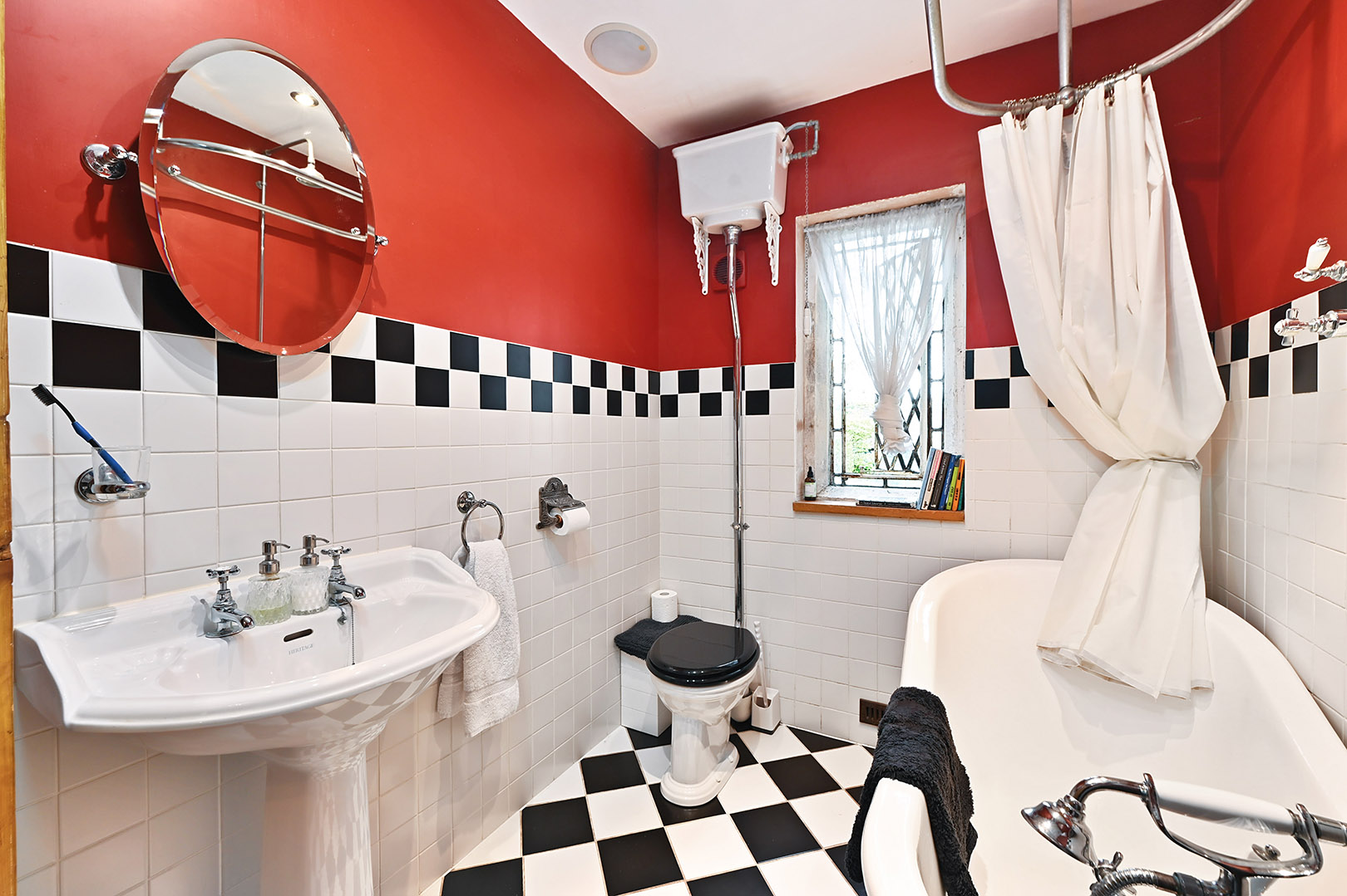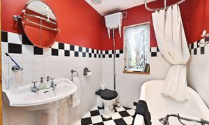 White suite comprising high level wc, pedestal wash hand basin, clawfoot roll top bath mixer tap and shower attachment with additional mains fed shower over, obscured window to rear, tiled flooring and partially tiled walls.
