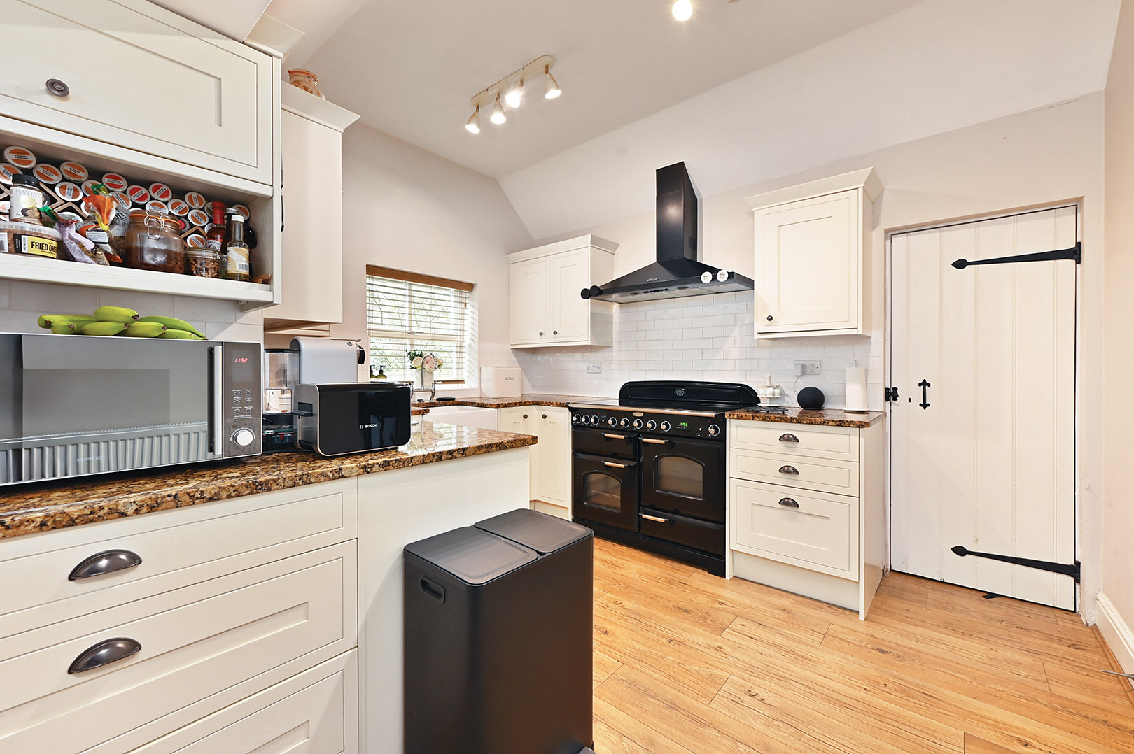 Range of white shaker style cupboards and drawers beneath marble worksurfaces with additional wall mounted units, window to rear, range cooker with extractor over, butler sink with chrome mixer tap over, integrated dishwasher, cupboard housing space and plumbing for washing machine, partially tiled walls.