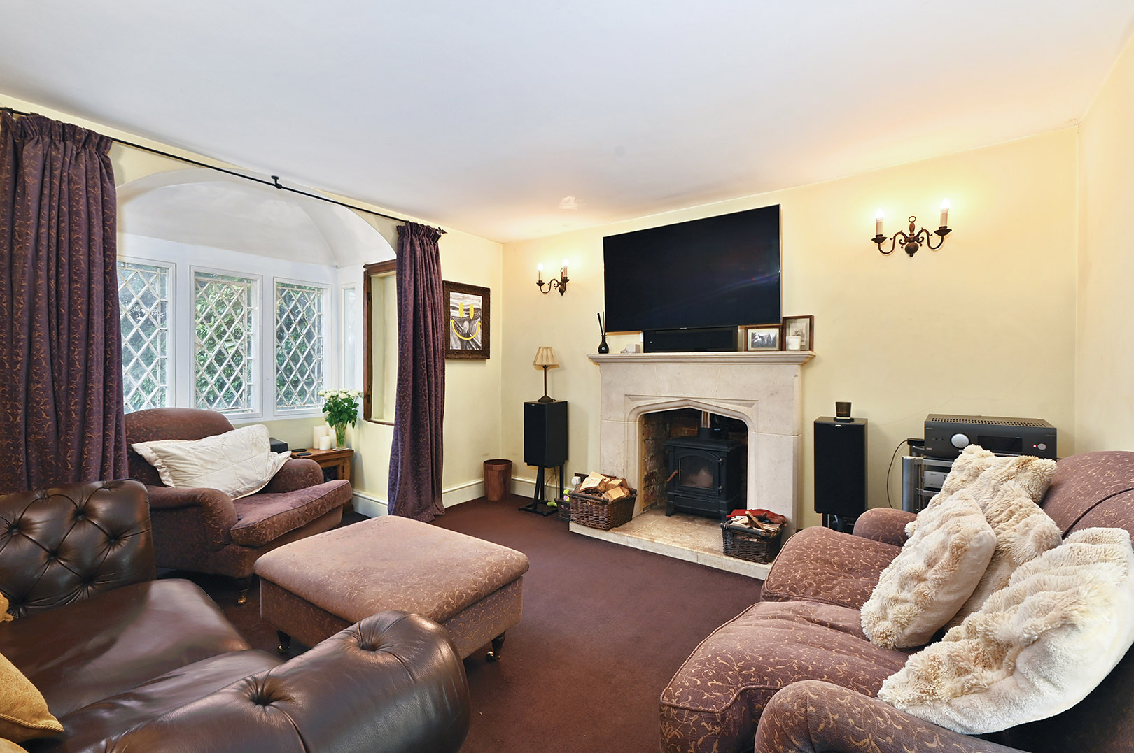 Carpeted, bay window to side, open fireplace in stone back and hearth.