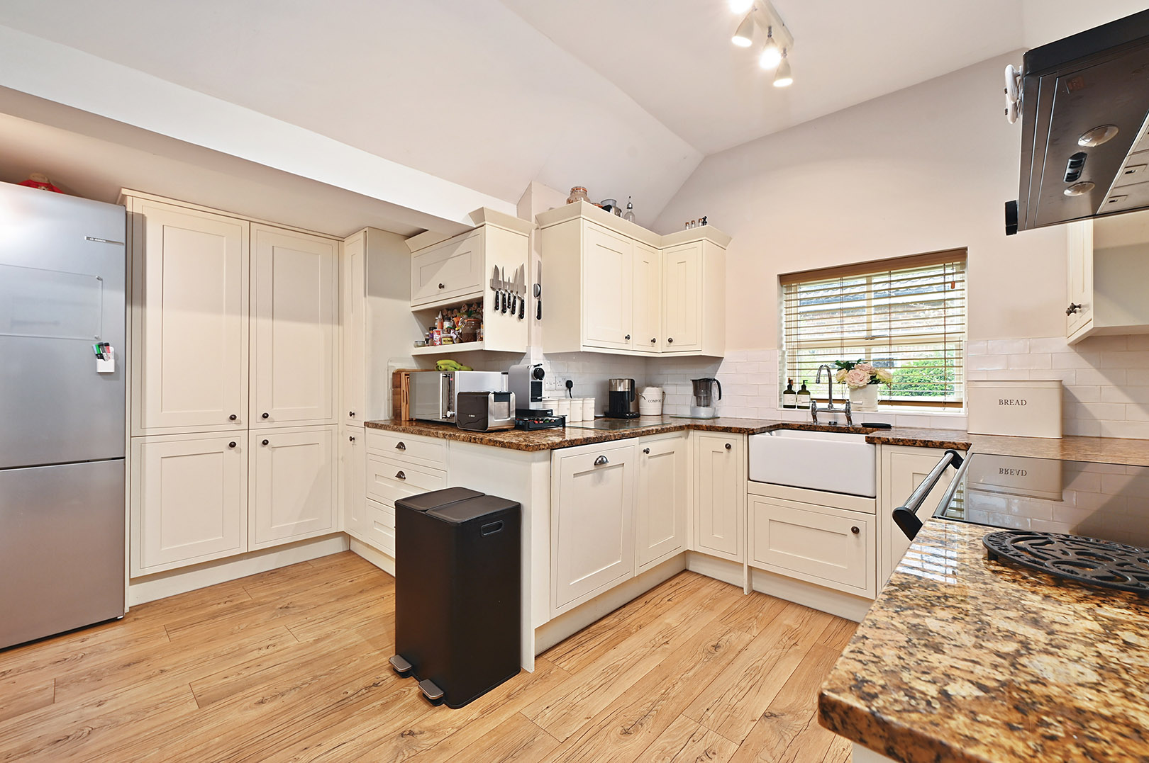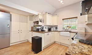 Set within gardens approaching half an acre, the property offers spacious and flexible living accommodation. The ground floor comprises a welcoming living room, a separate sitting room, a beautifully appointed library, a formal dining room, and a dedicated office or study—perfect for home working or quiet reflection. The modern fitted kitchen connects effortlessly to the dining room, creating a superb space for family gatherings and entertaining.
