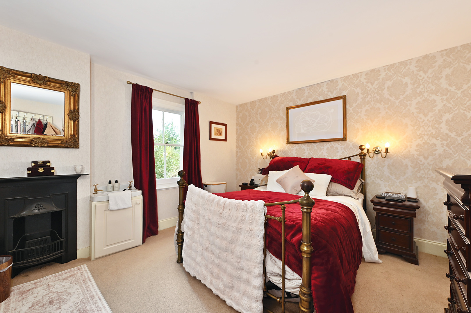Carpeted, window to side, wash hand basin, feature fireplace, door through to dressing room.