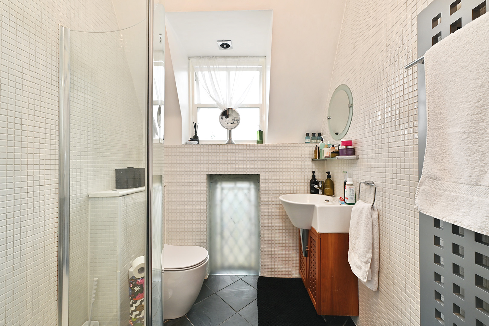 Wash hand basin in vanity storage units, low level wc, windows to rear, tiled walls and flooring, tiled shower cubicle.
