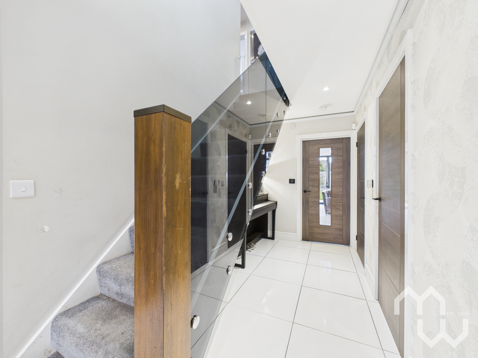 Bright, spacious entrance hallway with glass and walnut balustrade feature. Tiled flooring with underfloor heating.