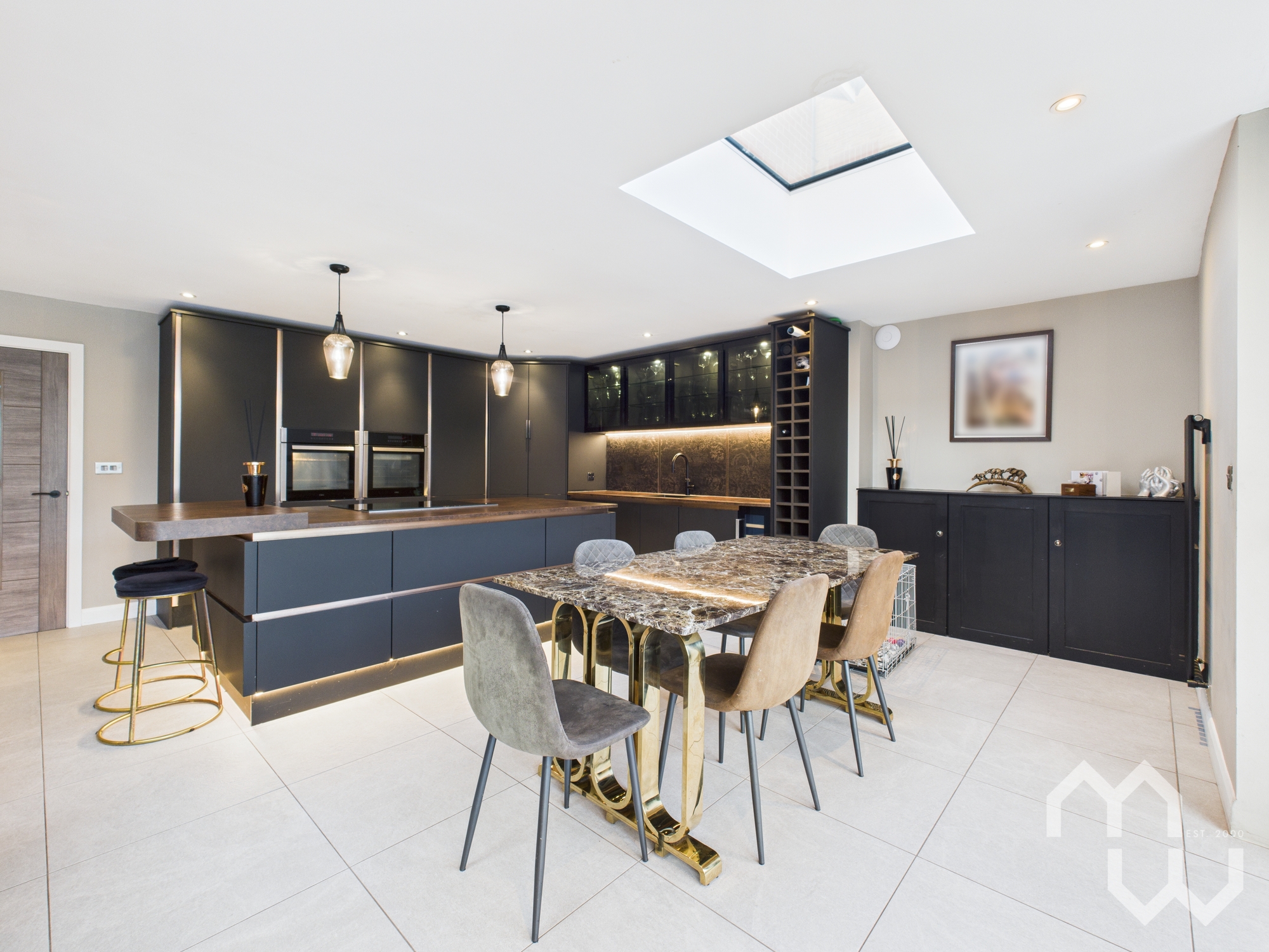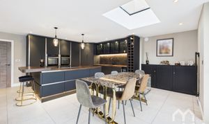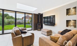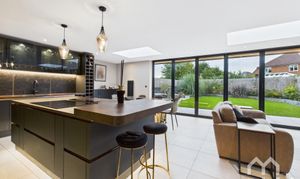 Stunning large, open plan extension to the rear of the property, comprising; Modern kitchen with eye & low level units, and island with breakfast bar. Sunken stainless steel basin sink. Integrated appliances include five ring induction hob with down-draft extractor, tall fridge, tall freezer, twin electric ovens, wine cooler and dishwasher. Integrated recycling bins. Dining area with sky light. Lounge area with corner feature wood burner and skylight. Feature radiators. Bi-folding doors across the full room creating indoor/outdoor space. Tiled flooring.