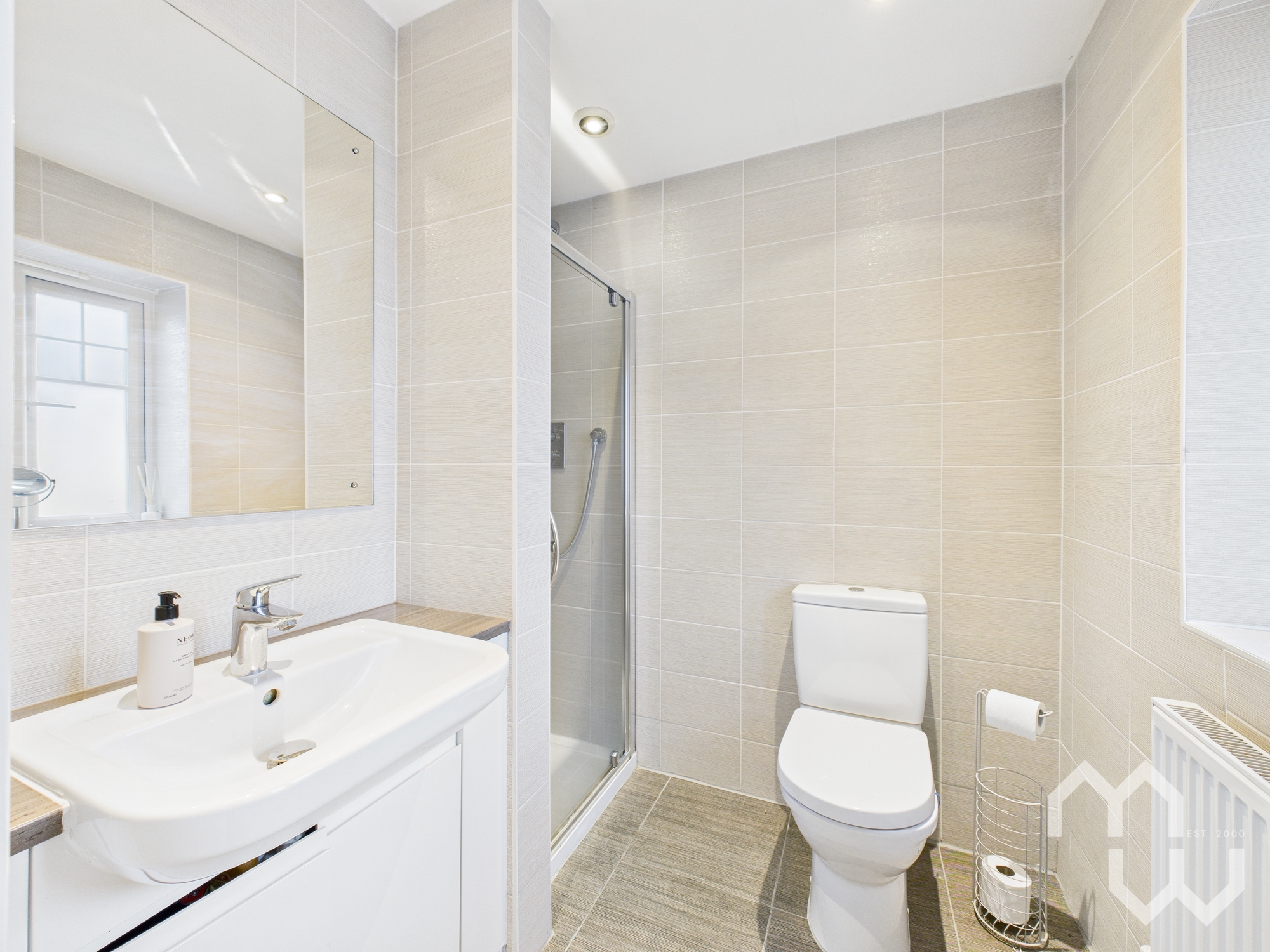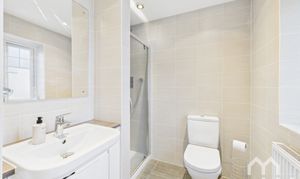 Three piece suite comprising mains shower cubicle, low level w.c and vanity wash hand basin. Fully tiled walls. Tiled flooring. Window to front.