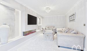 Stunning lounge with feature tiled wall. Electric flame effect fire. Bay window to front.