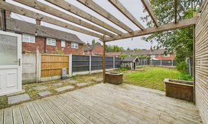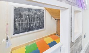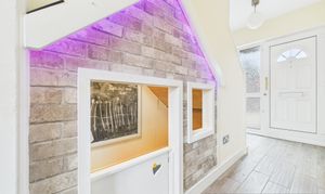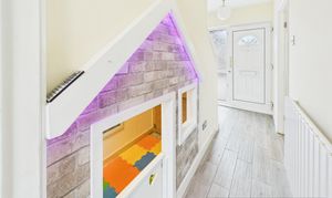 Families will love the thoughtfully designed play areas, including a built-in playhouse with colourful LED lighting and a dedicated chalkboard wall with foam flooring. Upstairs, the generous bedrooms boast built-in wardrobes with mirrored doors, offering both style and practicality. The bathrooms are finished to a high standard, with modern fixtures, walk-in shower, and a sleek vanity unit. Outside, a spacious garden provides a decked patio with pergola, manicured lawn and a charming outdoor playhouse, while the private paved driveway offers ample off-road parking and is bordered by lush, privacy-enhancing hedges. With elegant flooring, double glazing for energy efficiency, and a fresh, contemporary feel throughout, this home is move-in ready and perfect for anyone seeking style, space, and a welcoming atmosphere.