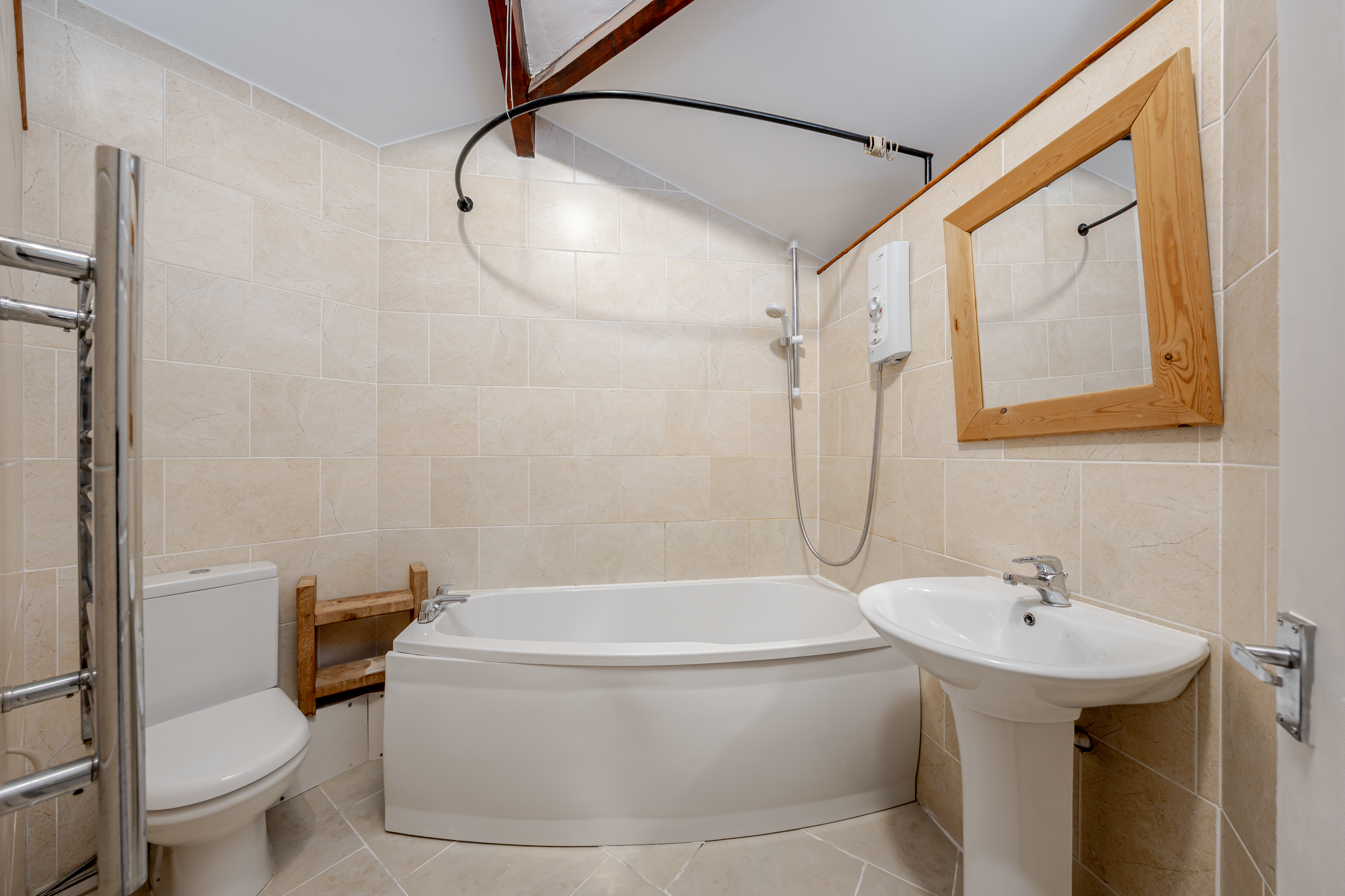 To the first floor are two bedrooms, including a generous main bedroom and a well proportioned second room. A modern bathroom is also located on this level and includes a bath with shower over, wash basin and WC.