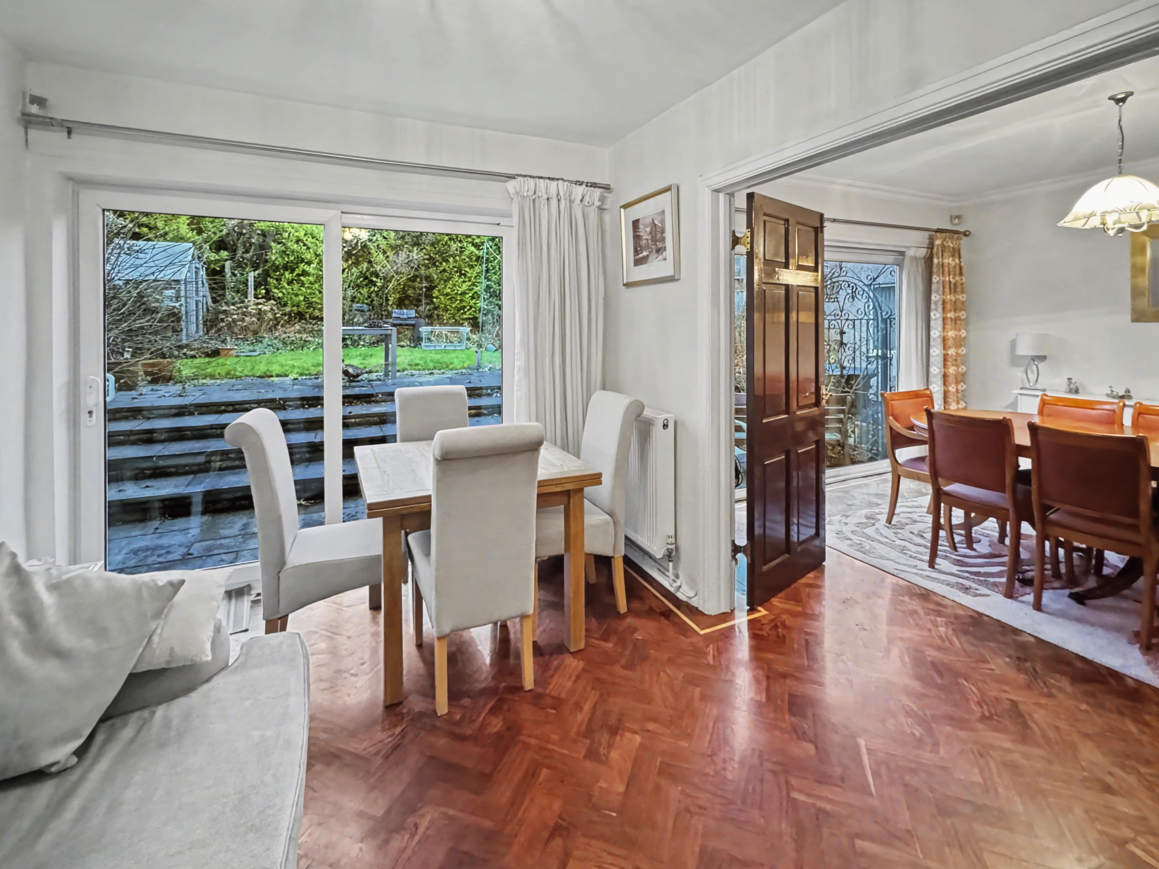 From the kitchen, the home opens into a bright and airy open-plan living and dining area, creating an ideal space for modern family living and entertaining. Sliding patio doors lead directly onto the expansive rear garden, allowing natural light to flood the room while enhancing the connection between the indoor and outdoor spaces.