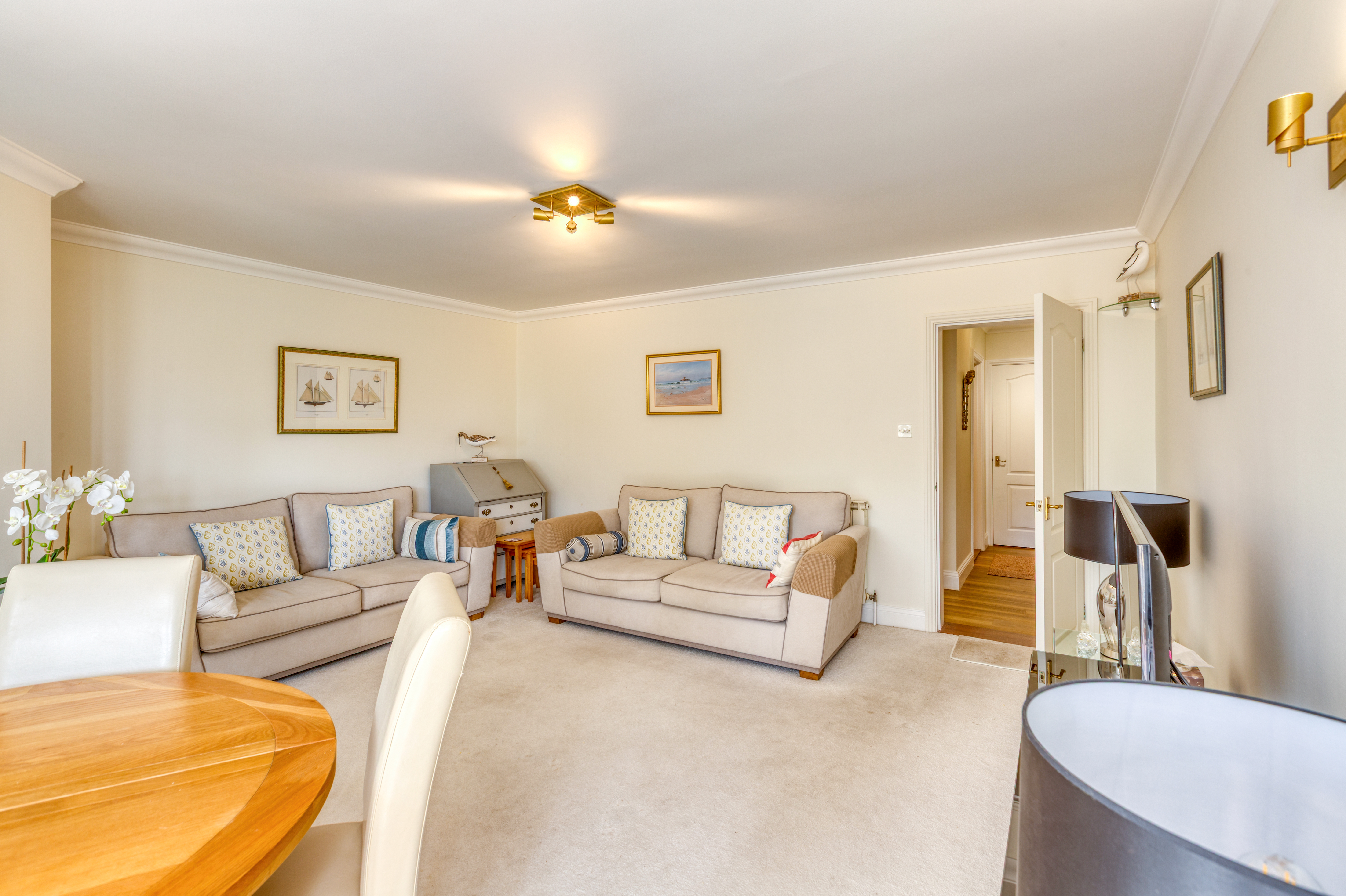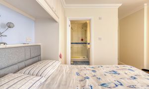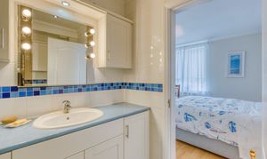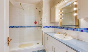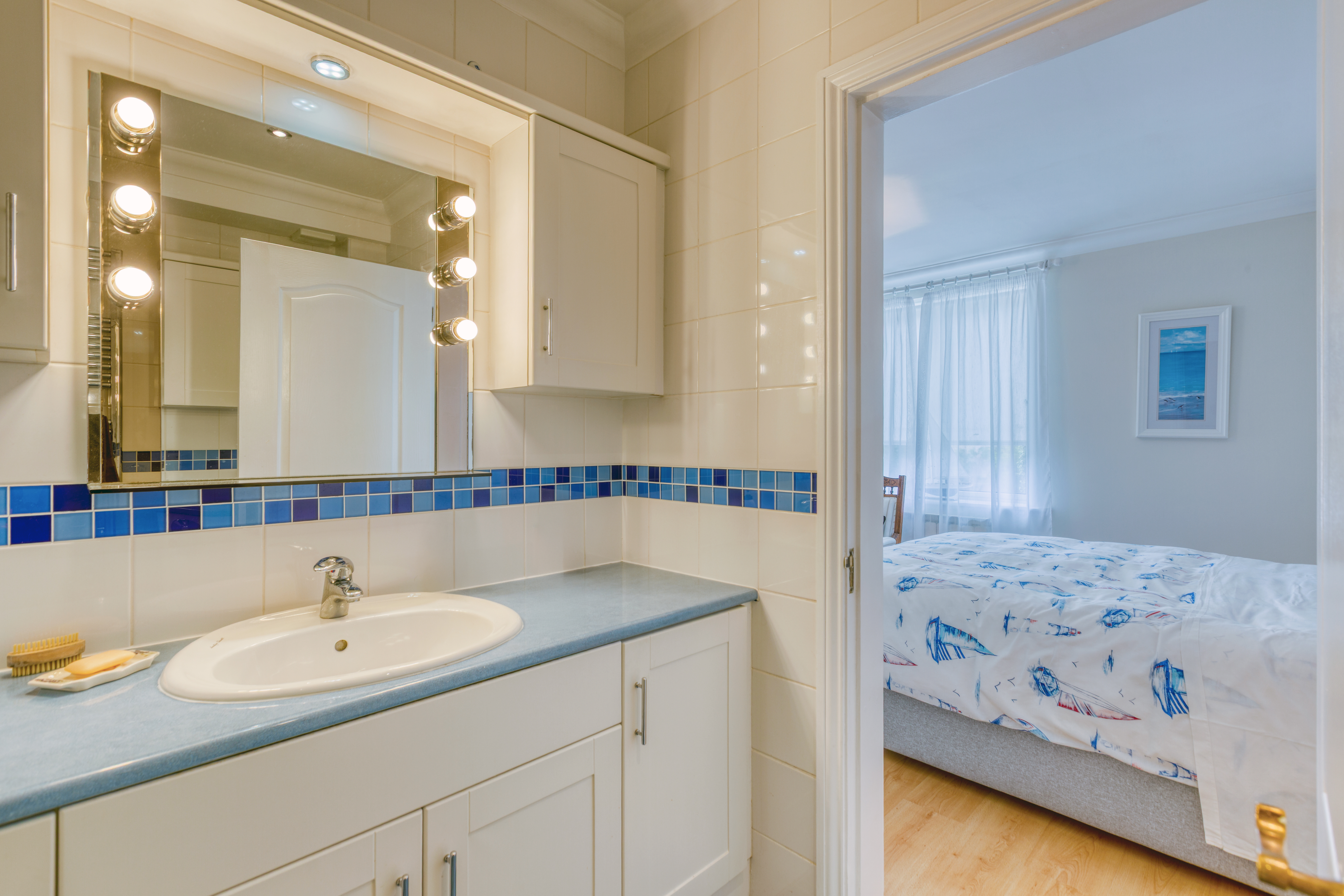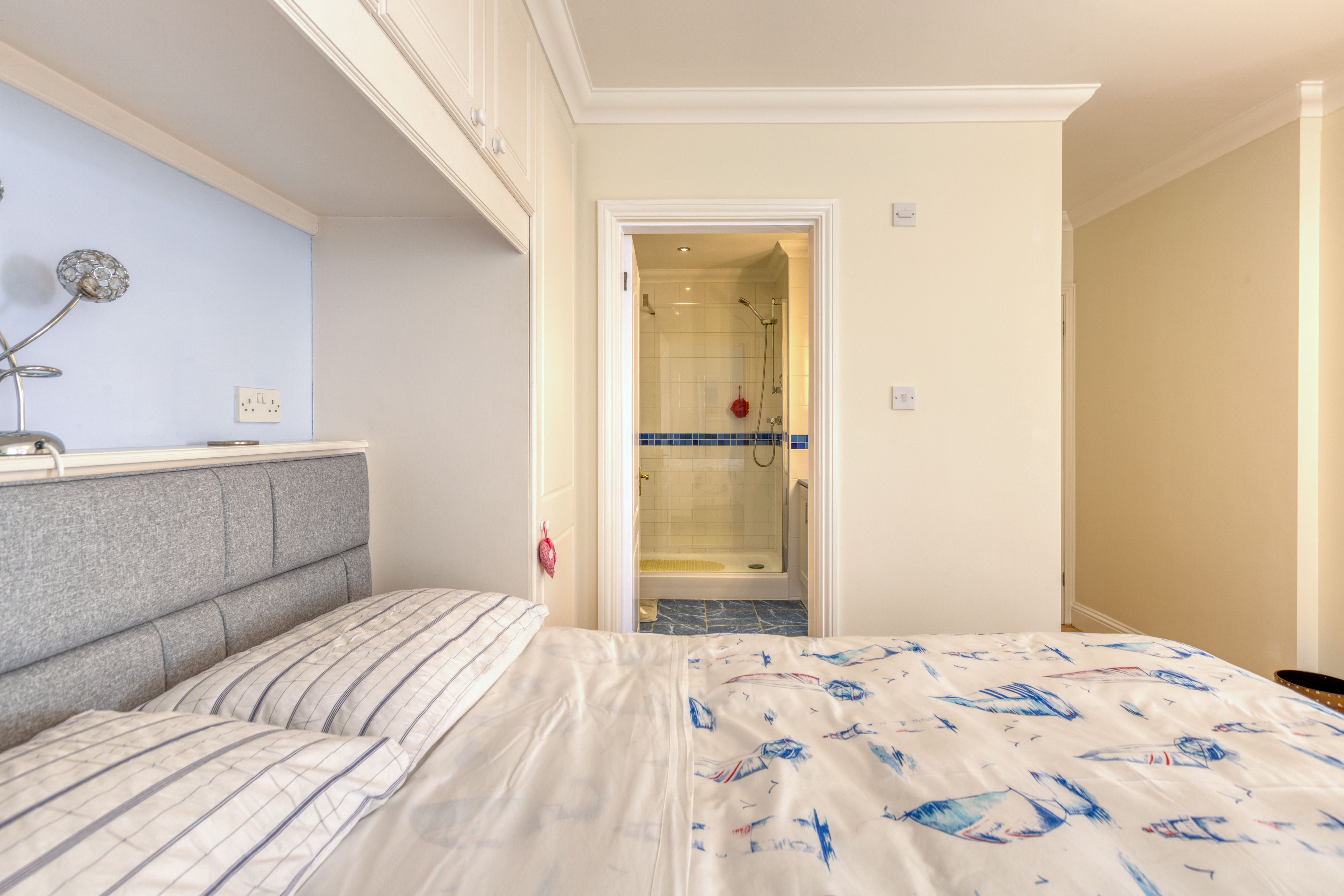 The apartment features a bright open-plan living and dining area with large windows that fill the space with natural light. The kitchen is well-fitted with quality appliances, while both double bedrooms benefit from fitted bedroom furniture. The primary bedroom benefits from seaviews and includes an en-suite showroom, with an additional stylish house bathroom for guests and serving the second bedroom