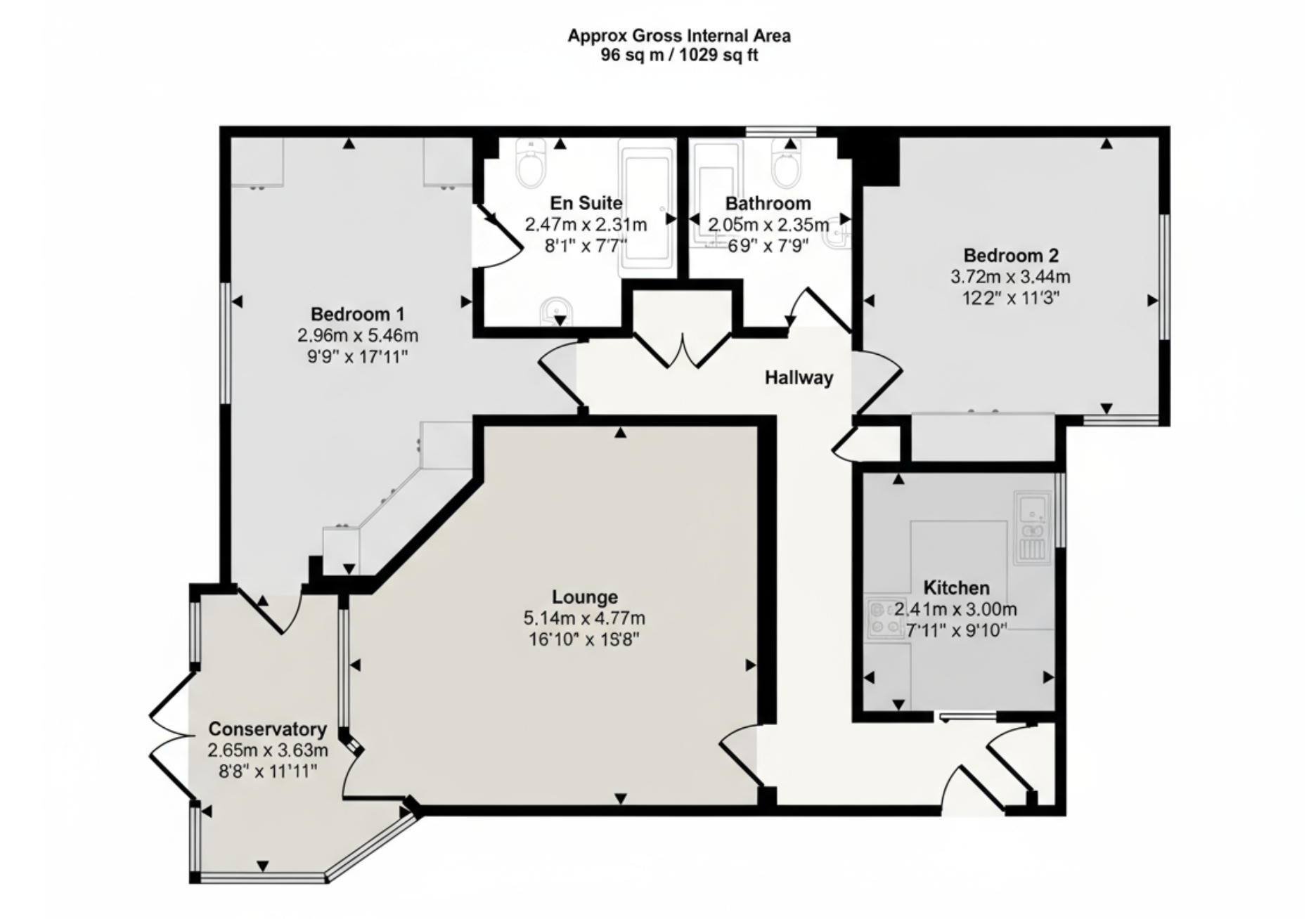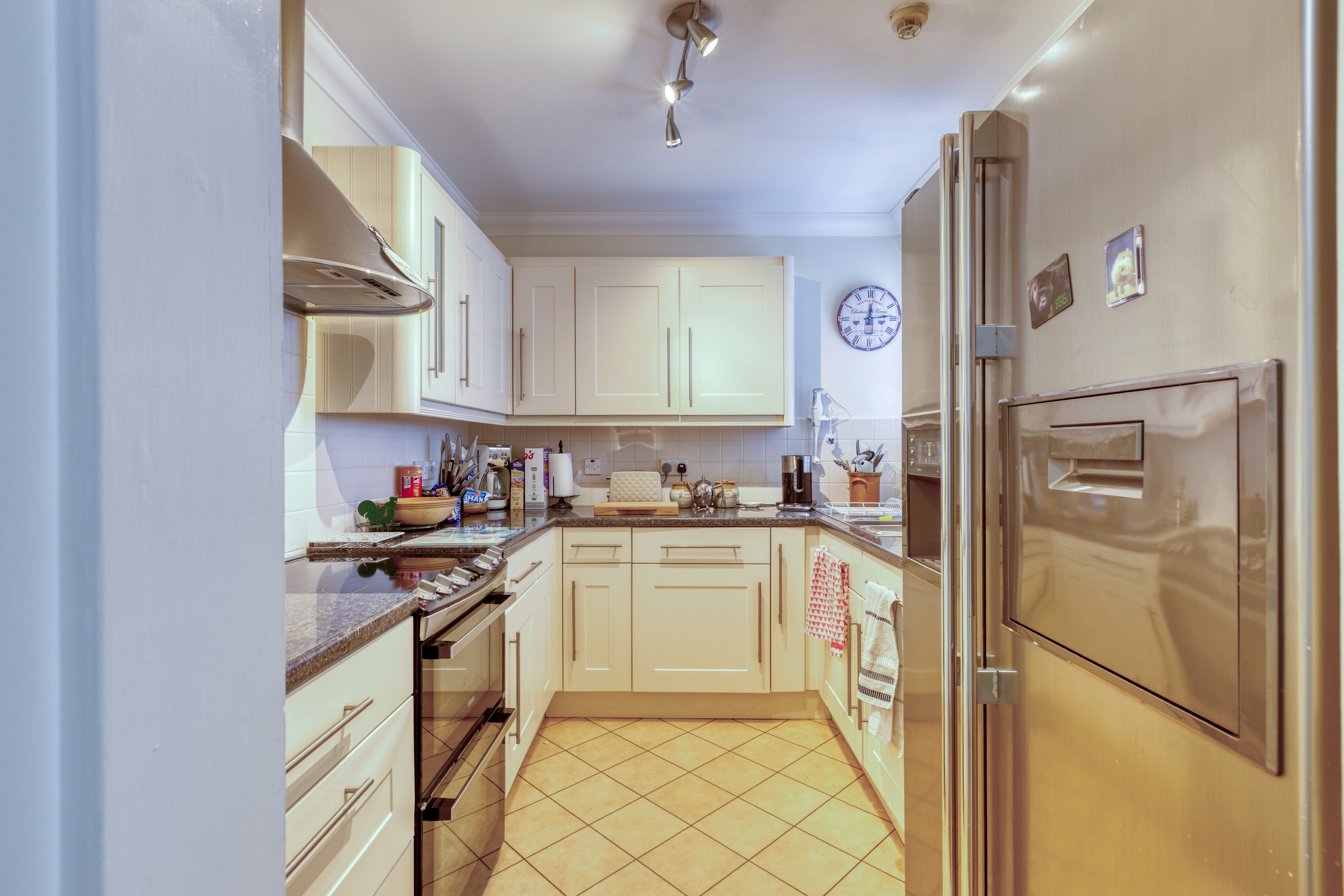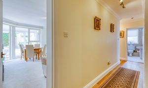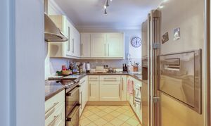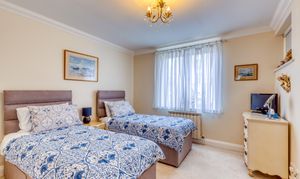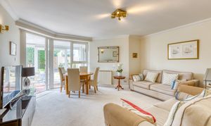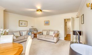 The apartment features a bright open-plan living and dining area with large windows that fill the space with natural light. The kitchen is well-fitted with quality appliances, while both double bedrooms benefit from fitted bedroom furniture. The primary bedroom benefits from seaviews and includes an en-suite showroom, with an additional stylish house bathroom for guests and serving the second bedroom