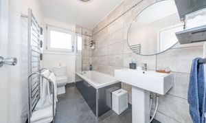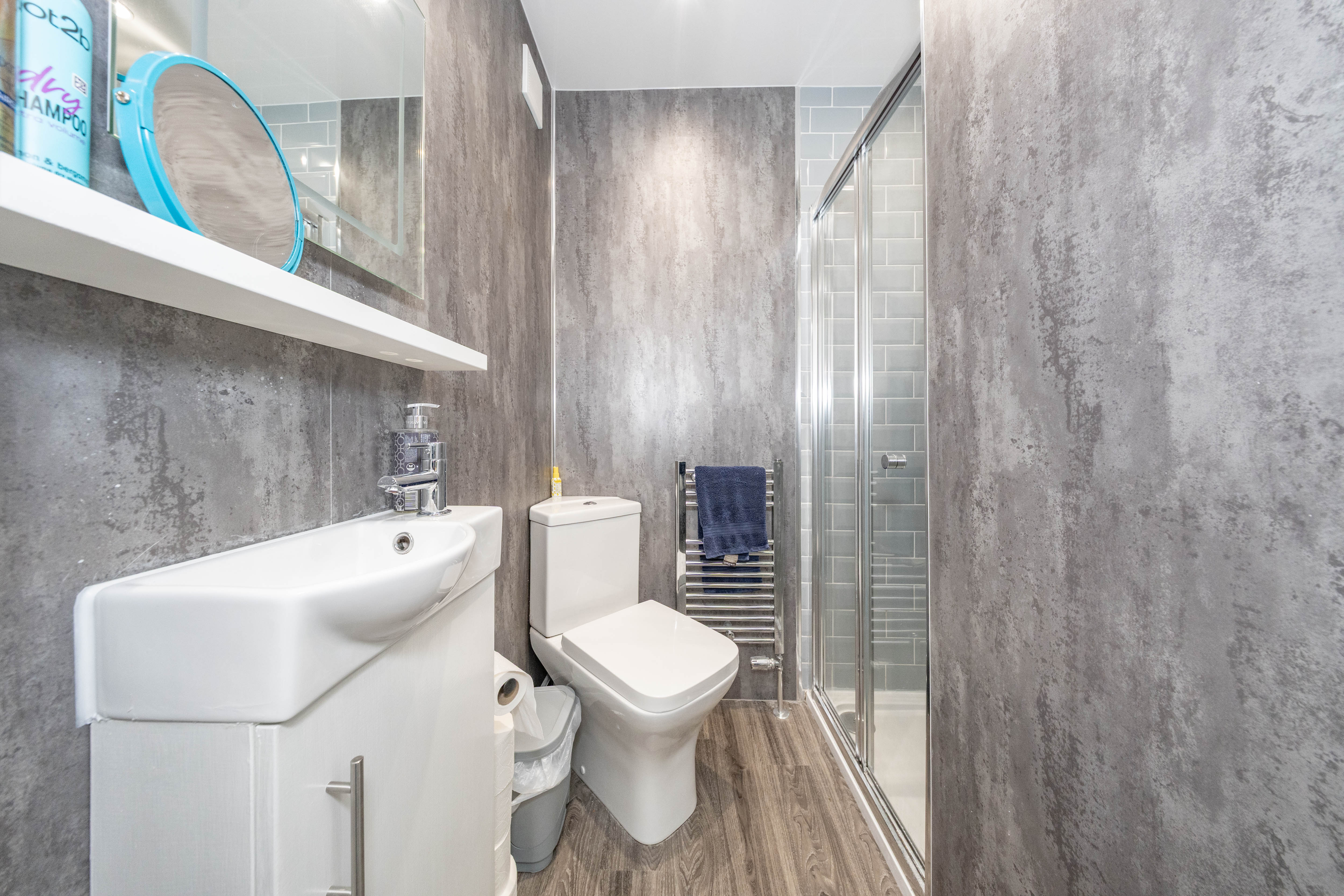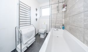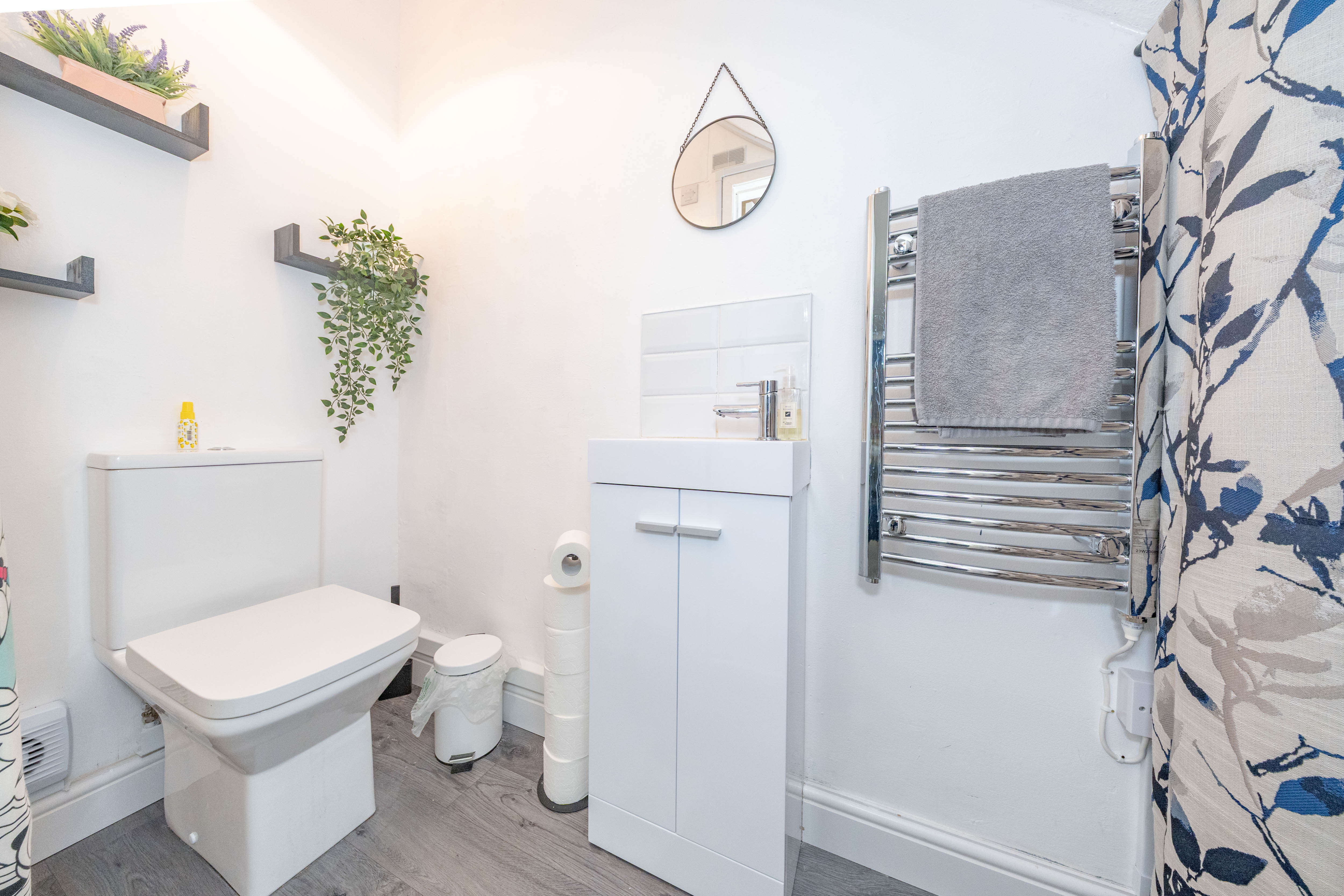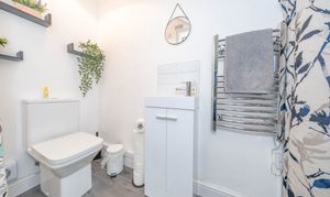 A recently fitted downstairs WC comprising a modern toilet and vanity unit with basin and mixer tap. The space is finished with a sleek stainless steel towel radiator, offering both style and practicality.