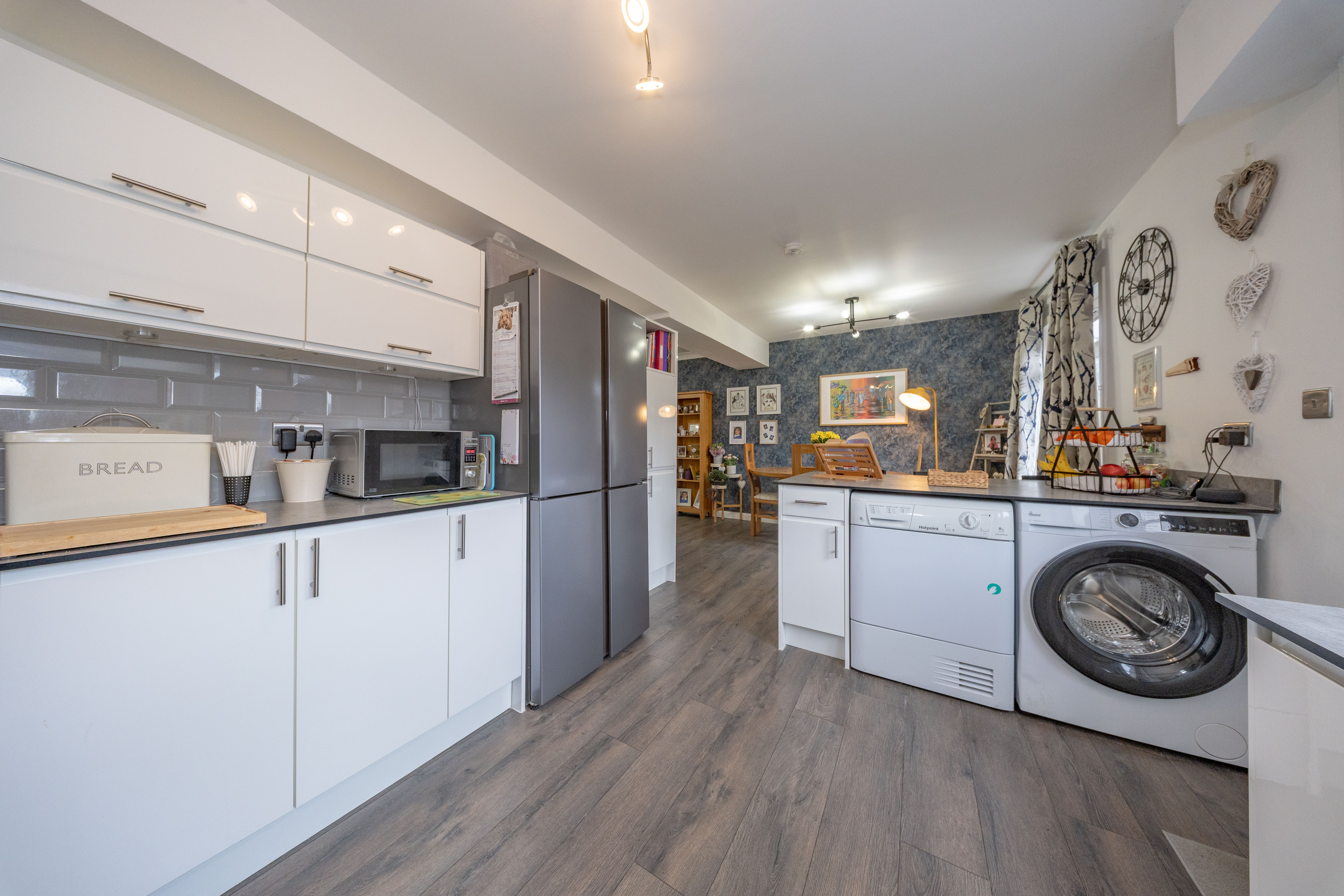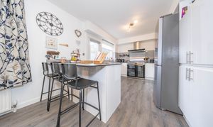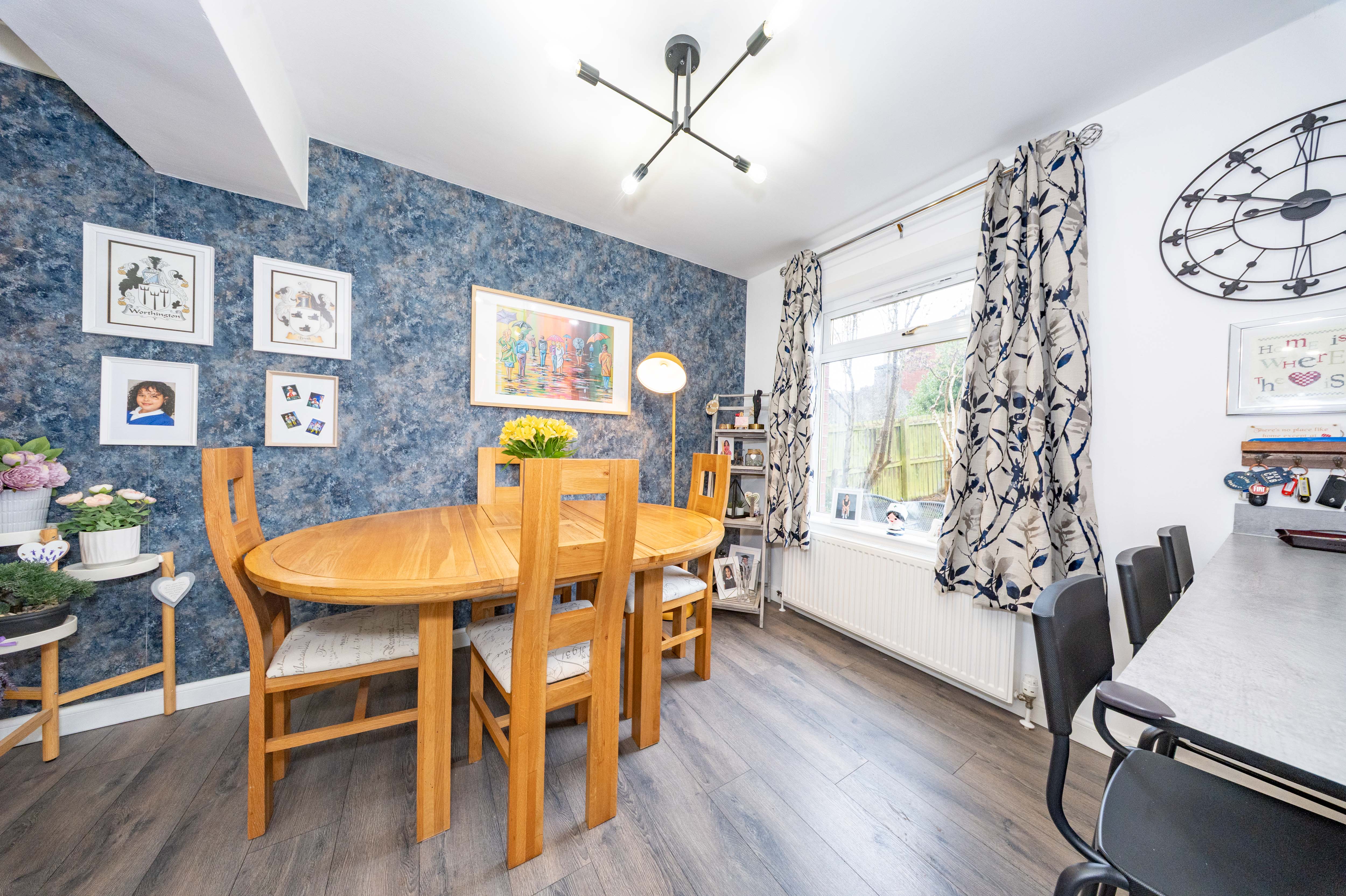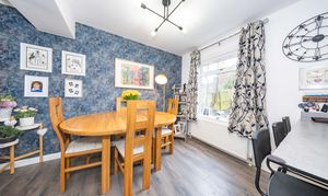 A generous sized dining area featuring neutral décor and a window overlooking the rear garden, creating a bright and inviting setting. The space is further enhanced by a convenient breakfast bar with seating for two, ideal for casual dining or morning coffee.
