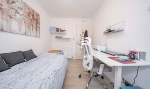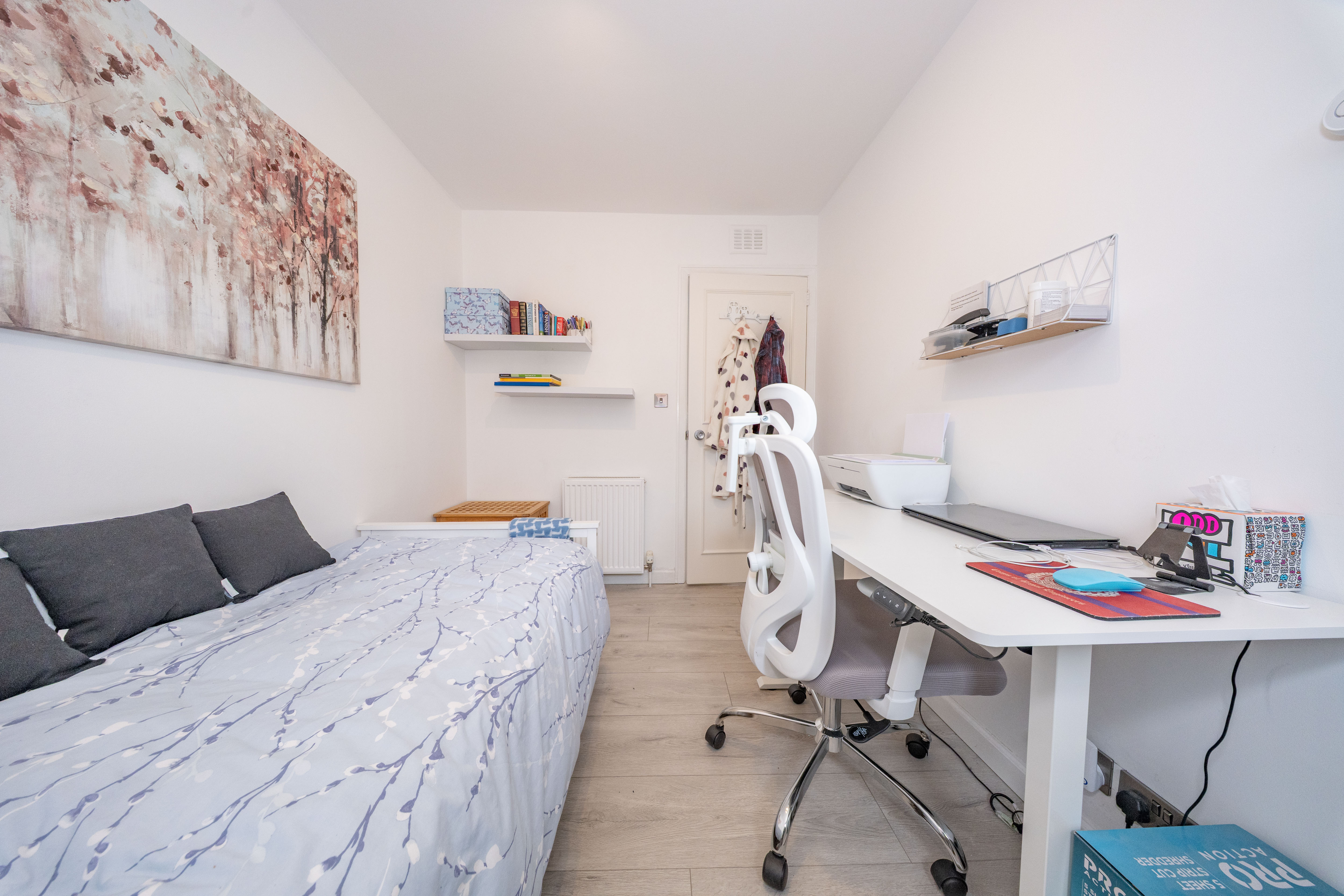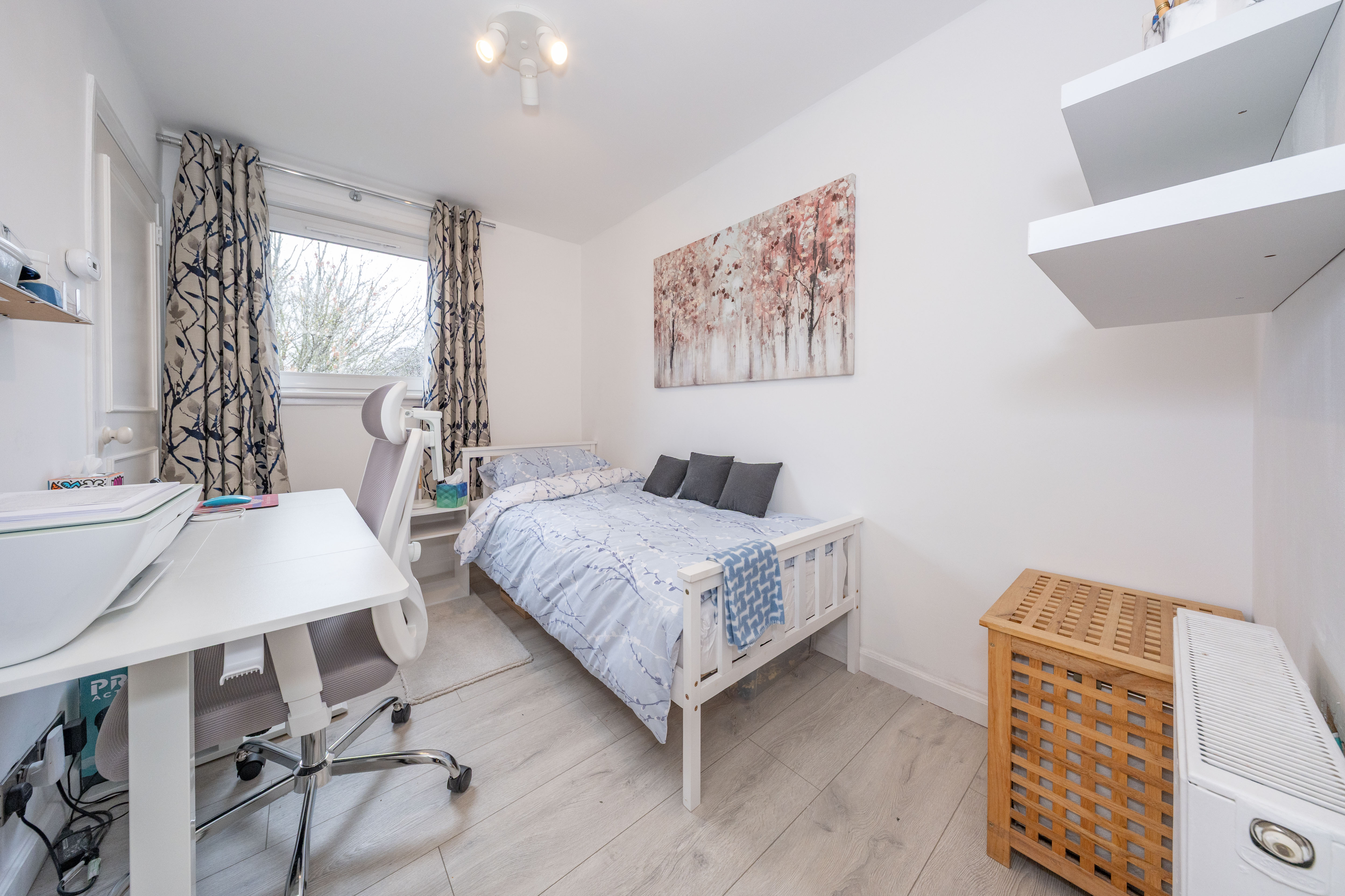 A versatile bedroom currently used as both a sleeping area and home office, featuring laminate flooring and crisp white painted walls. A front-facing window provides ample natural light, creating a bright and functional space.