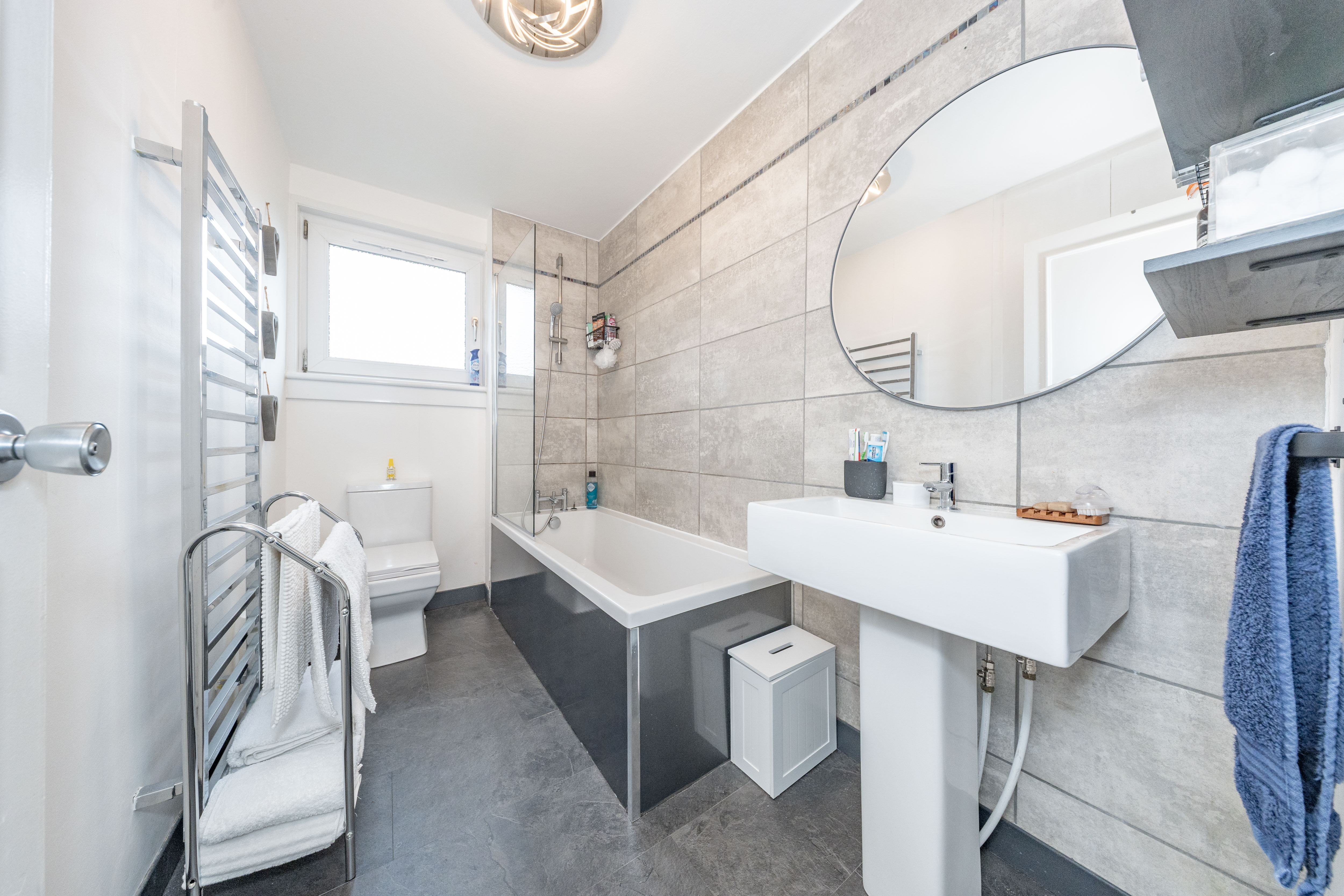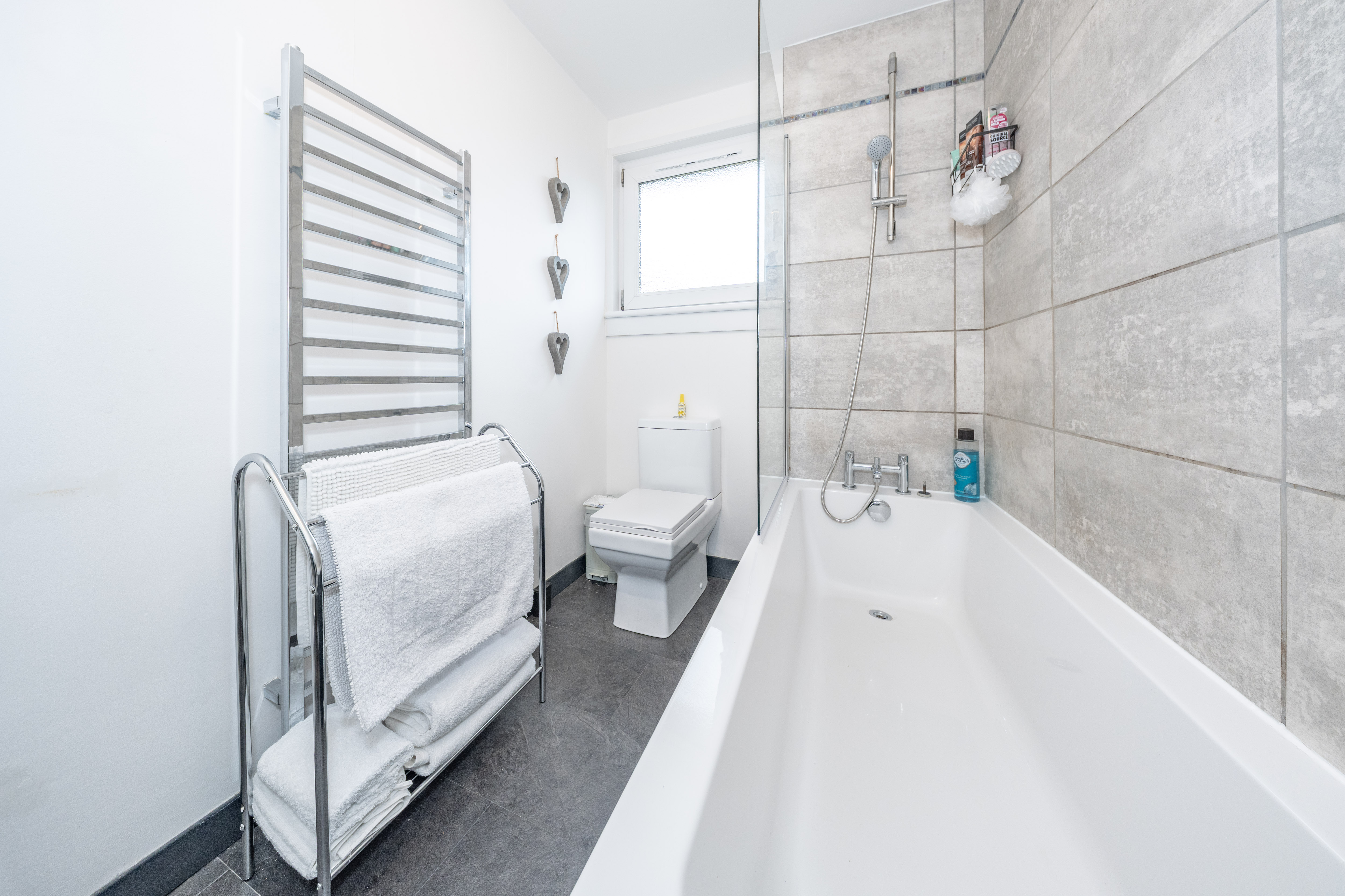 A gorgeous modern family bathroom comprising a white bath with overhead shower and glass screen. The space is enhanced by partial wall tiling and includes a WC and a stylish basin with mixer tap. A large silver designer towel radiator completes the room, adding both elegance and practicality.