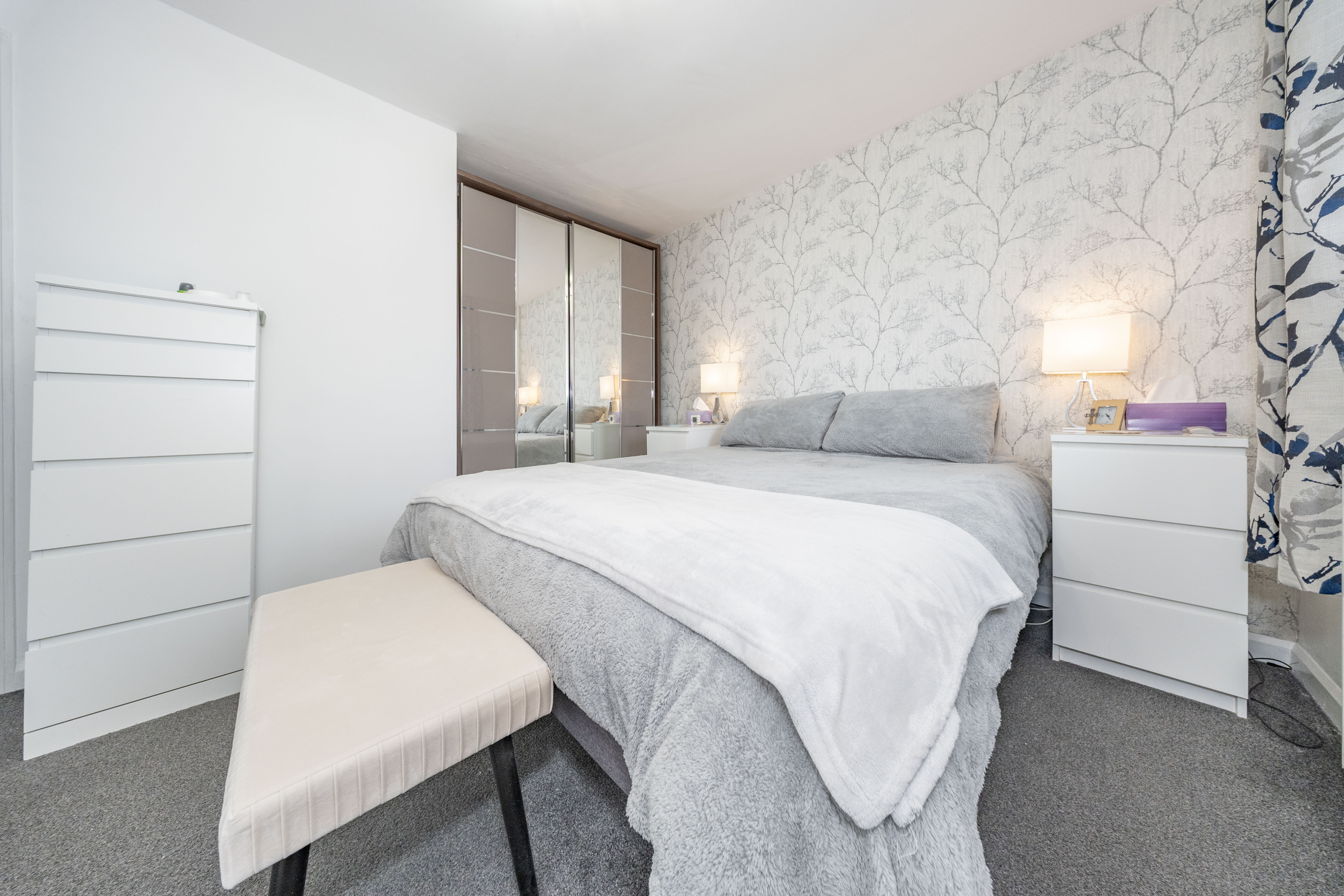 A generously sized primary bedroom featuring a plush dark grey carpet and a double mirrored wardrobe, offering both comfort and excellent storage. A window provides pleasant views over the fully enclosed rear garden, while the room further benefits from direct access to a private en suite.