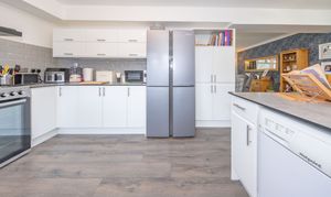 A generously sized modern kitchen fitted with a range of ample wall and base units, providing excellent storage. The space is complemented by a stylish designer sink with mixer tap, a feature range cooker with electric oven, and a tiled splashback wall, combining practicality with contemporary style.
