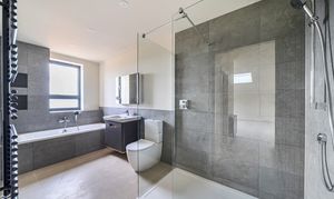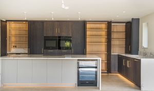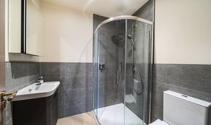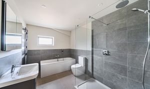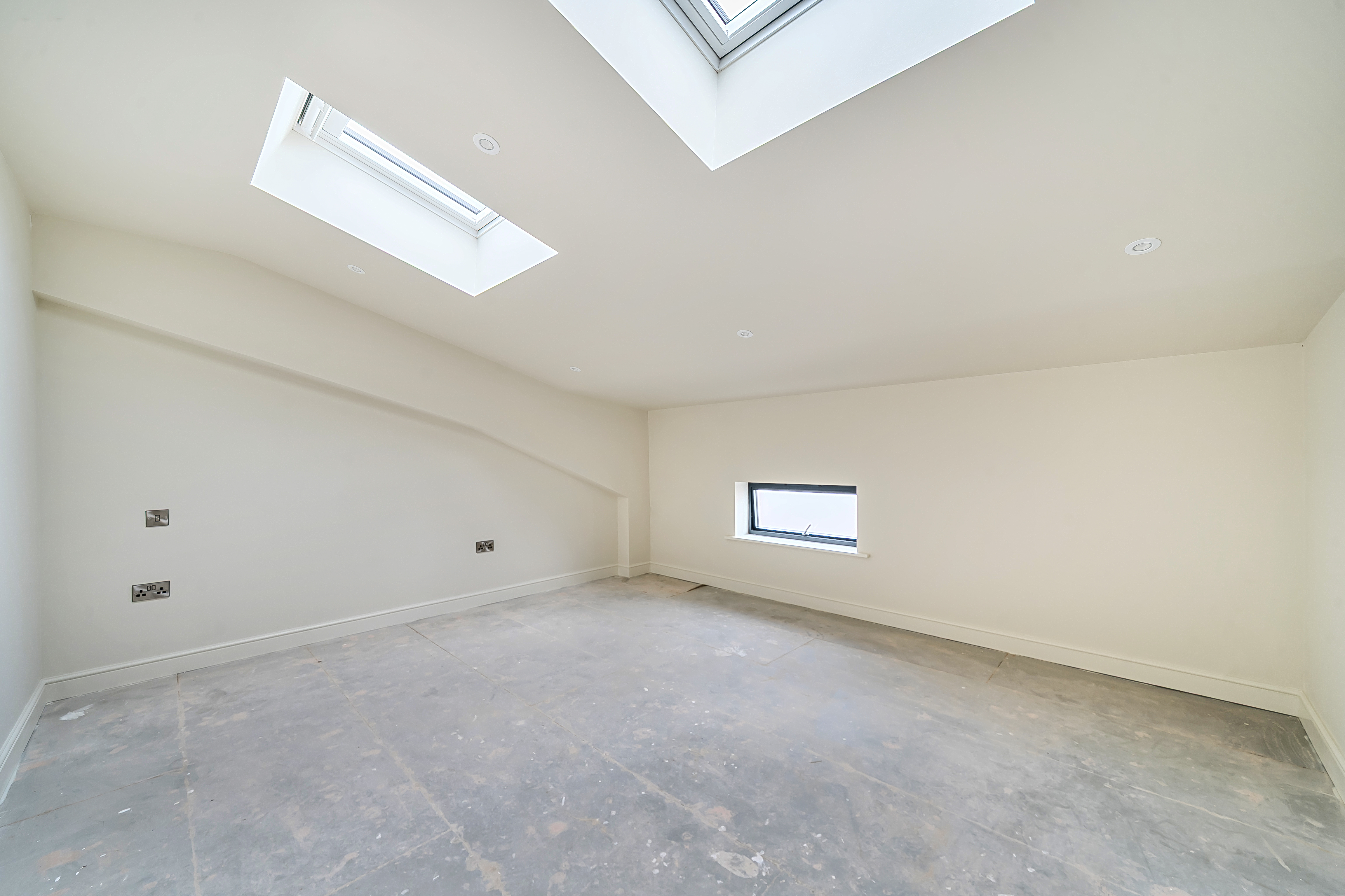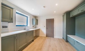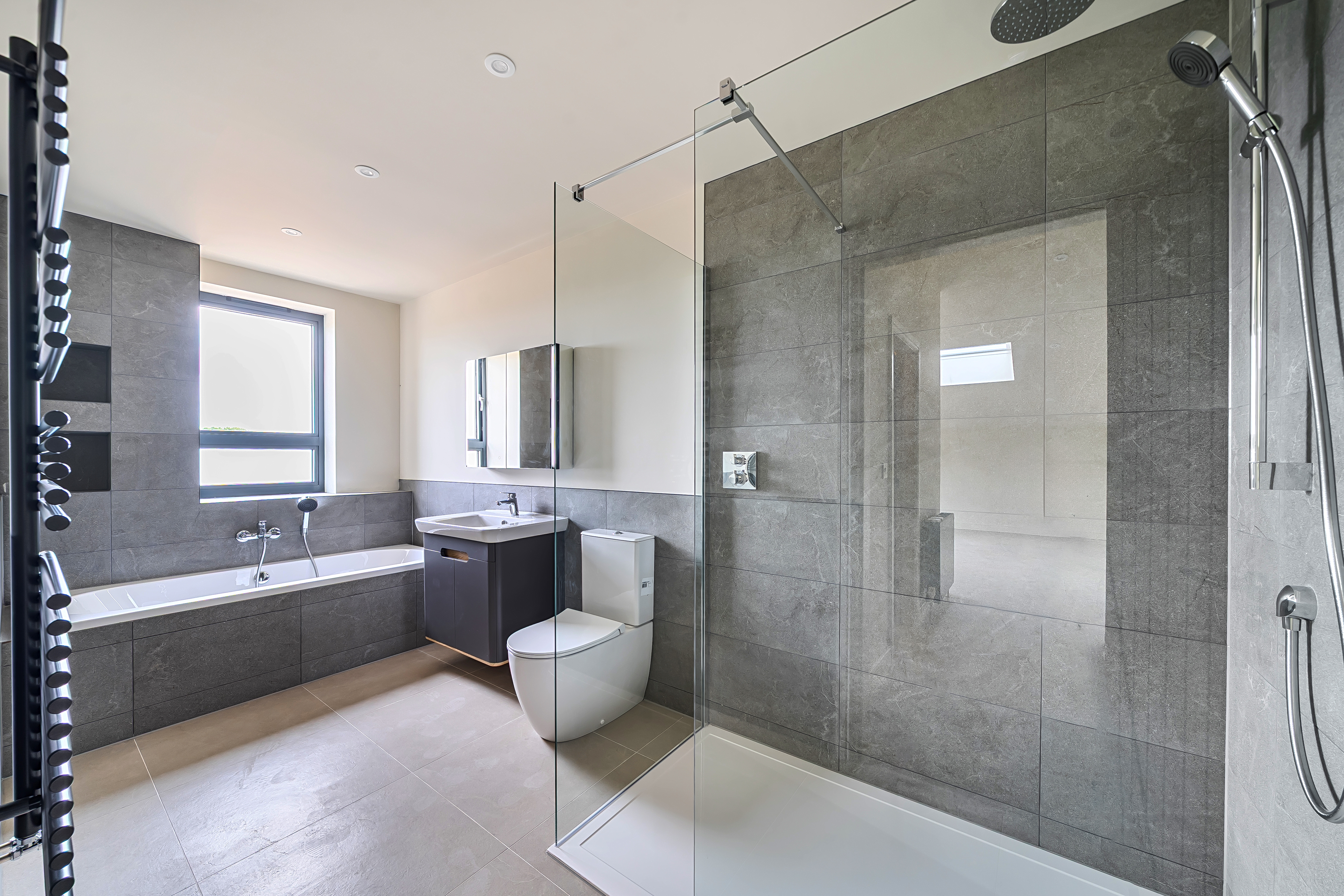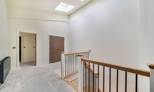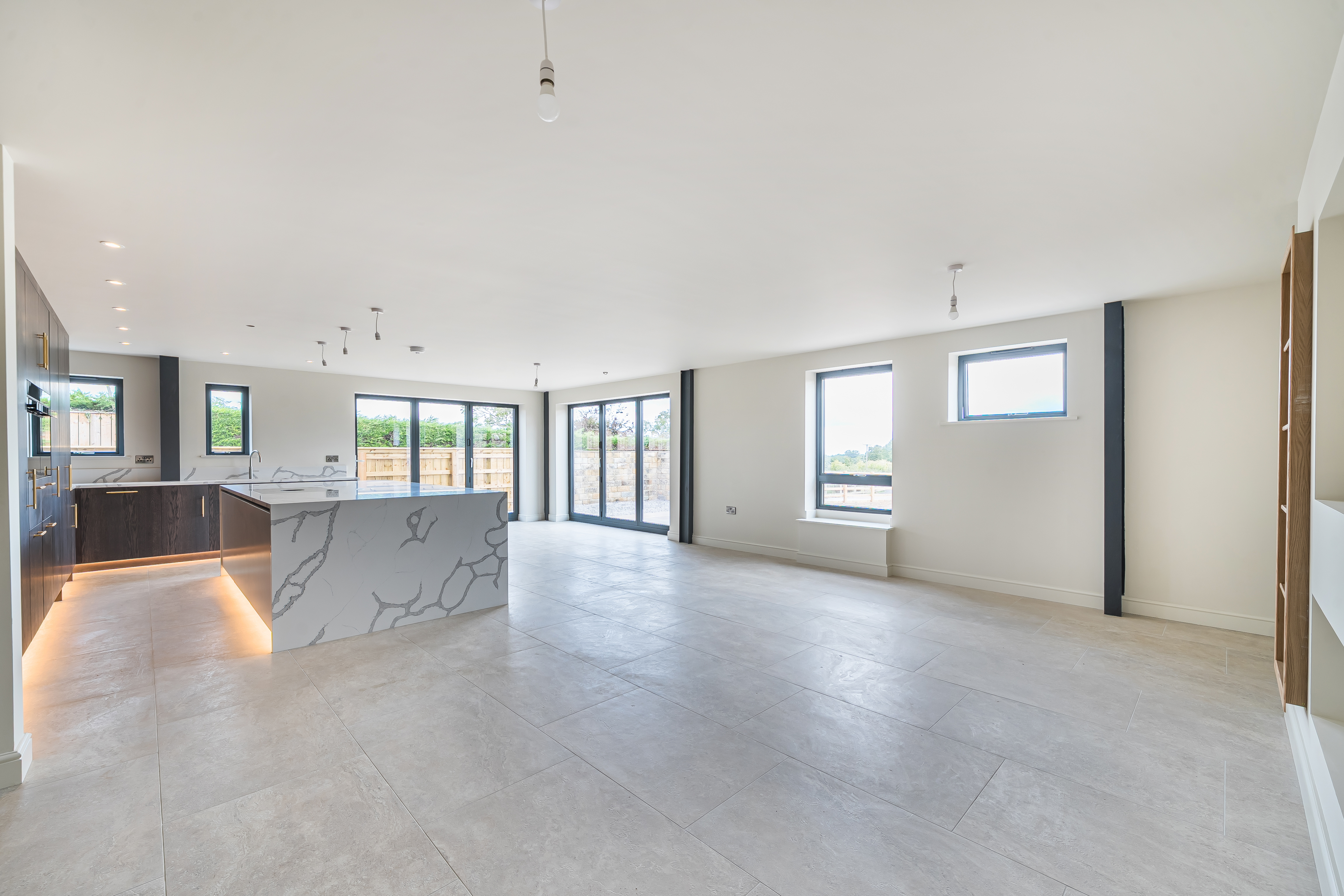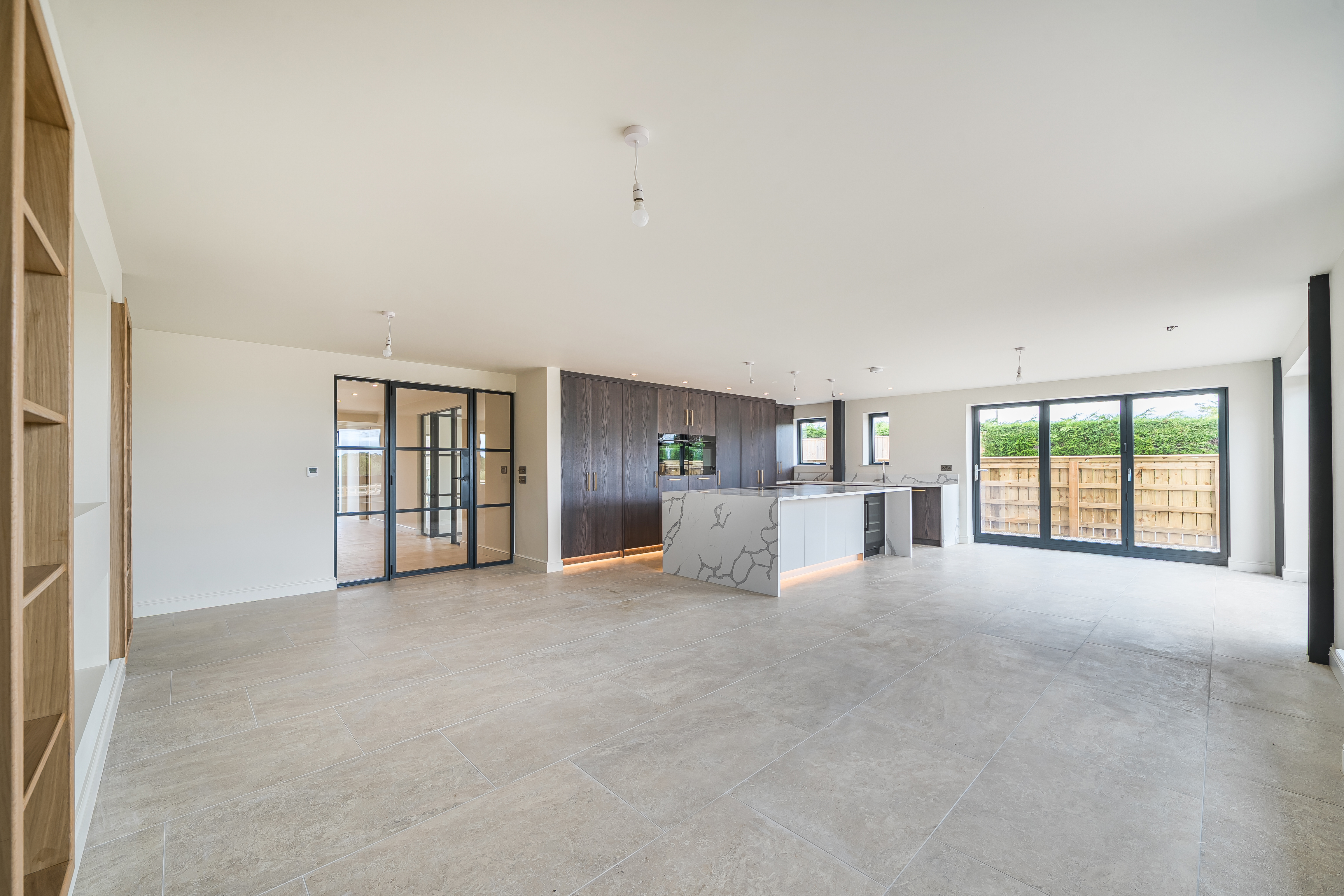 Upstairs, the principal suite includes a dressing room and luxurious en-suite with both walk-in and over-bath showers. Three further double bedrooms share a sleek family bathroom, while a fifth bedroom or study enjoys its own en-suite shower room.