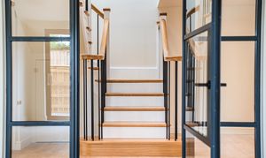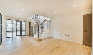 The spacious ground floor features underfloor heating throughout and an impressive open-plan kitchen, dining, and living area — ideal for entertaining or family gatherings. The bespoke kitchen, which incorporates a bespoke Clarity Arts kitchen with integrated Siemens appliances, marble work surfaces including the large central island and feature lighting at floor level and within the pantry units, opens onto the garden via two sliding doors, while a stylish reception room, utility, boiler room, and guest WC complete the layout.