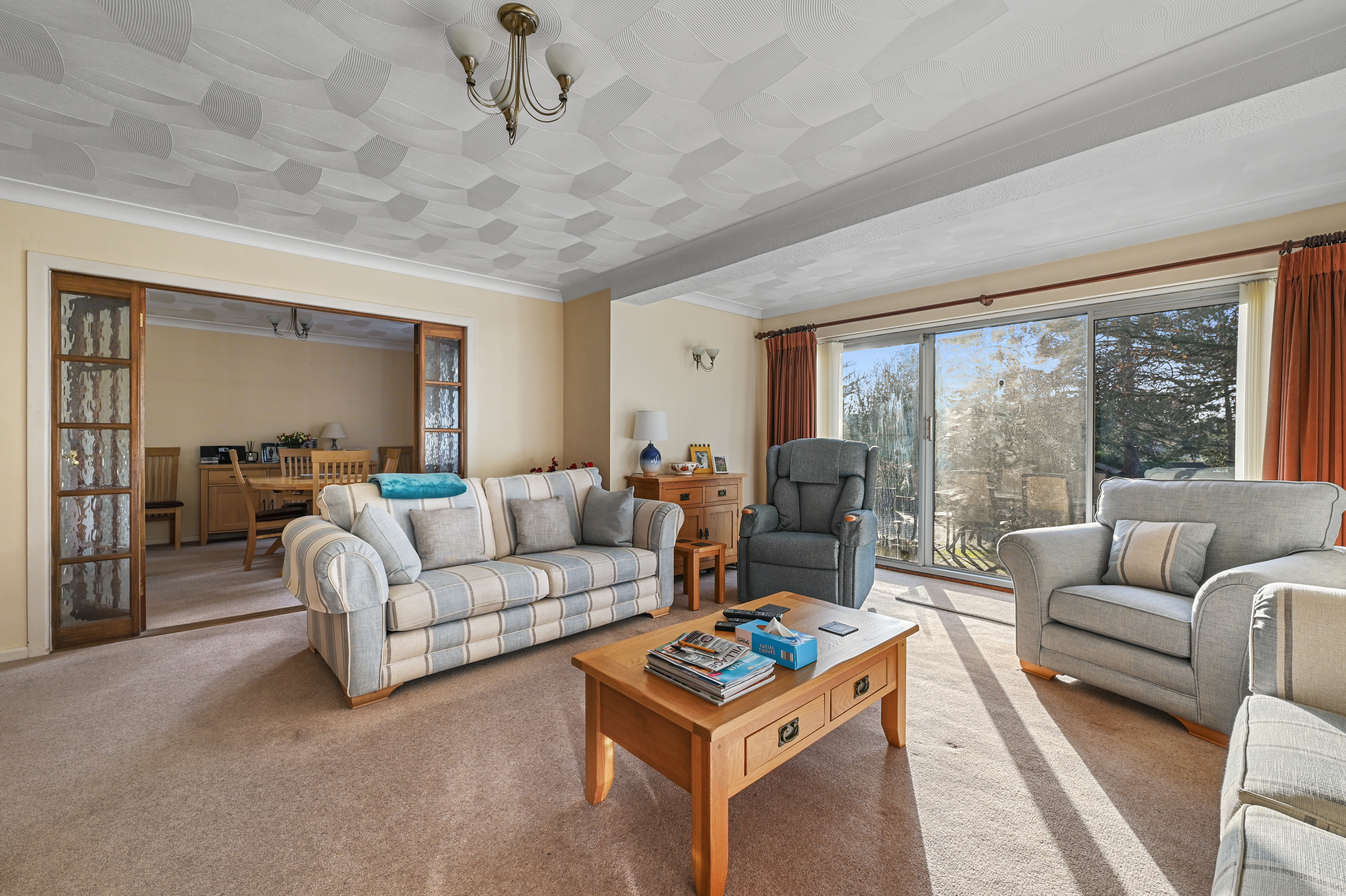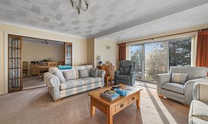 Offset from the kitchen is the formal dining room offering a delightful aspect overlooking the splendid grounds. Entered via glass panelled double doors, the generous sized main reception room, again to rear aspect, includes a gas fireplace with brick surround as well as attractive sliding doors opening on to the garden.