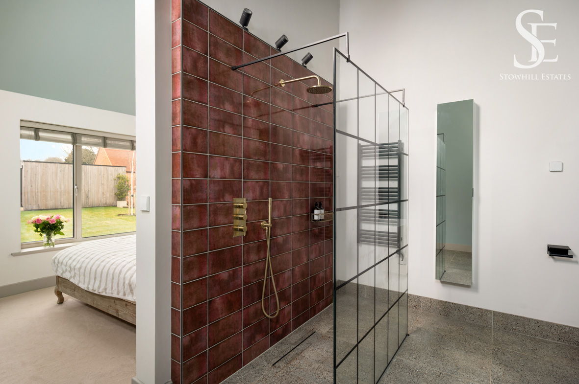 Here, gilded fixtures, a black-framed Crittall shower screen and a walk-through wet room shower set the tone for opulent living. A freestanding bathtub, perfectly positioned, offers a spa-like soak at the end of the busy working day.