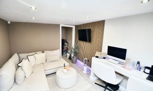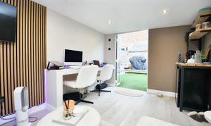 Externally, there is a generously-sized garden to the rear with artificial grass, decking and stones. The garden provides access to the outbuilding, which houses a large office and a storage area. To the front of the property there is a low-maintenance courtyard garden that was renovated two years ago.