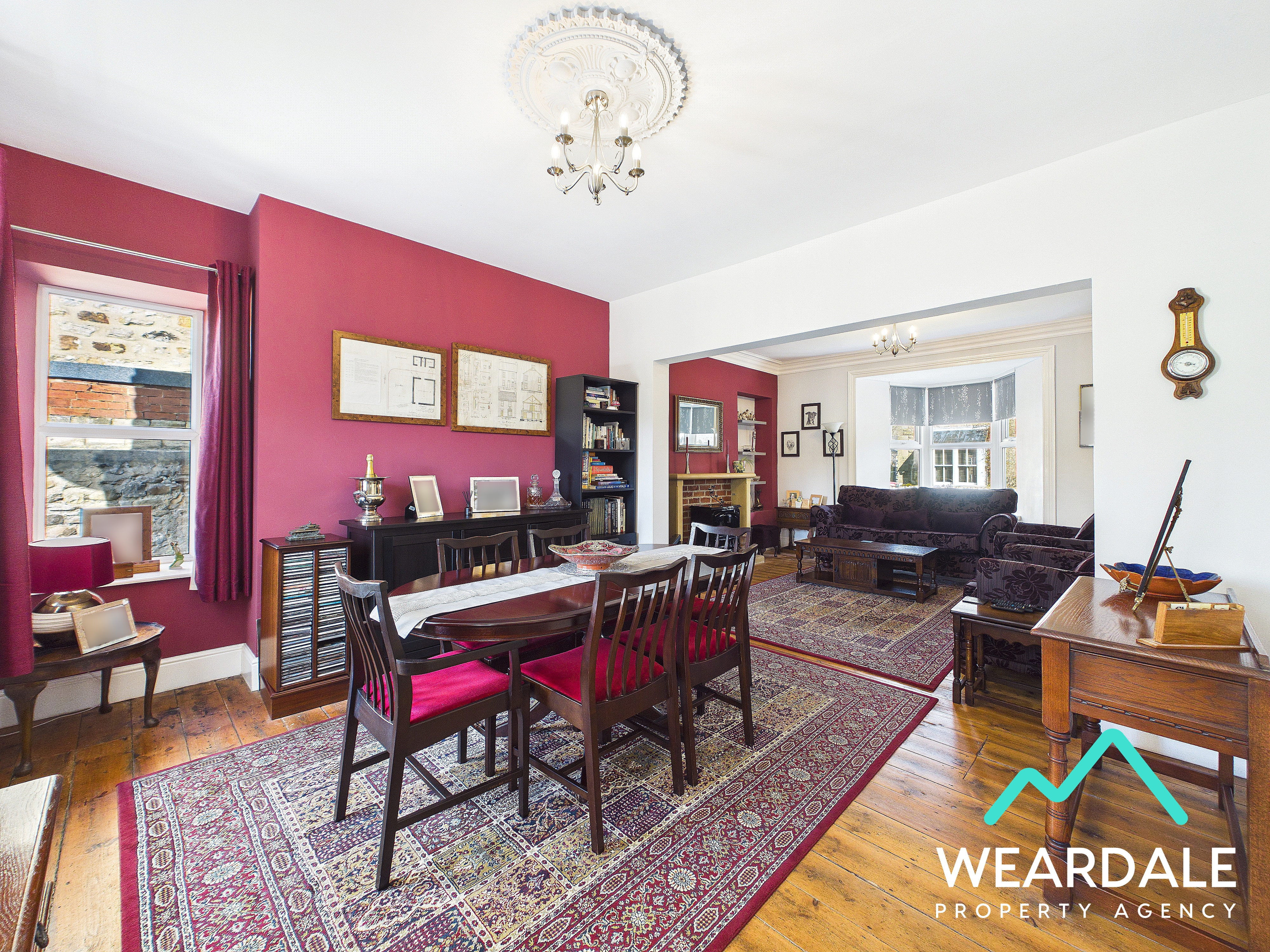 - Positioned to the rear of the property, being open-plan (4.12m x 7.39m) with the living room, and providing onward internal access to the kitchen and rear porch - Well-proportioned dining area - Dual aspect with a double-glazed uPVC window with deep wooden sill to the Southern aspect, looking over the rear yard and providing magnificent views of the surrounding hillsides. There is a further double-glazed uPVC window with deep wooden sill to the Western aspect - Original wood flooring - Neutrally decorated - Traditional ceiling rose - Ceiling light fitting - Two radiators - Space for dining furniture