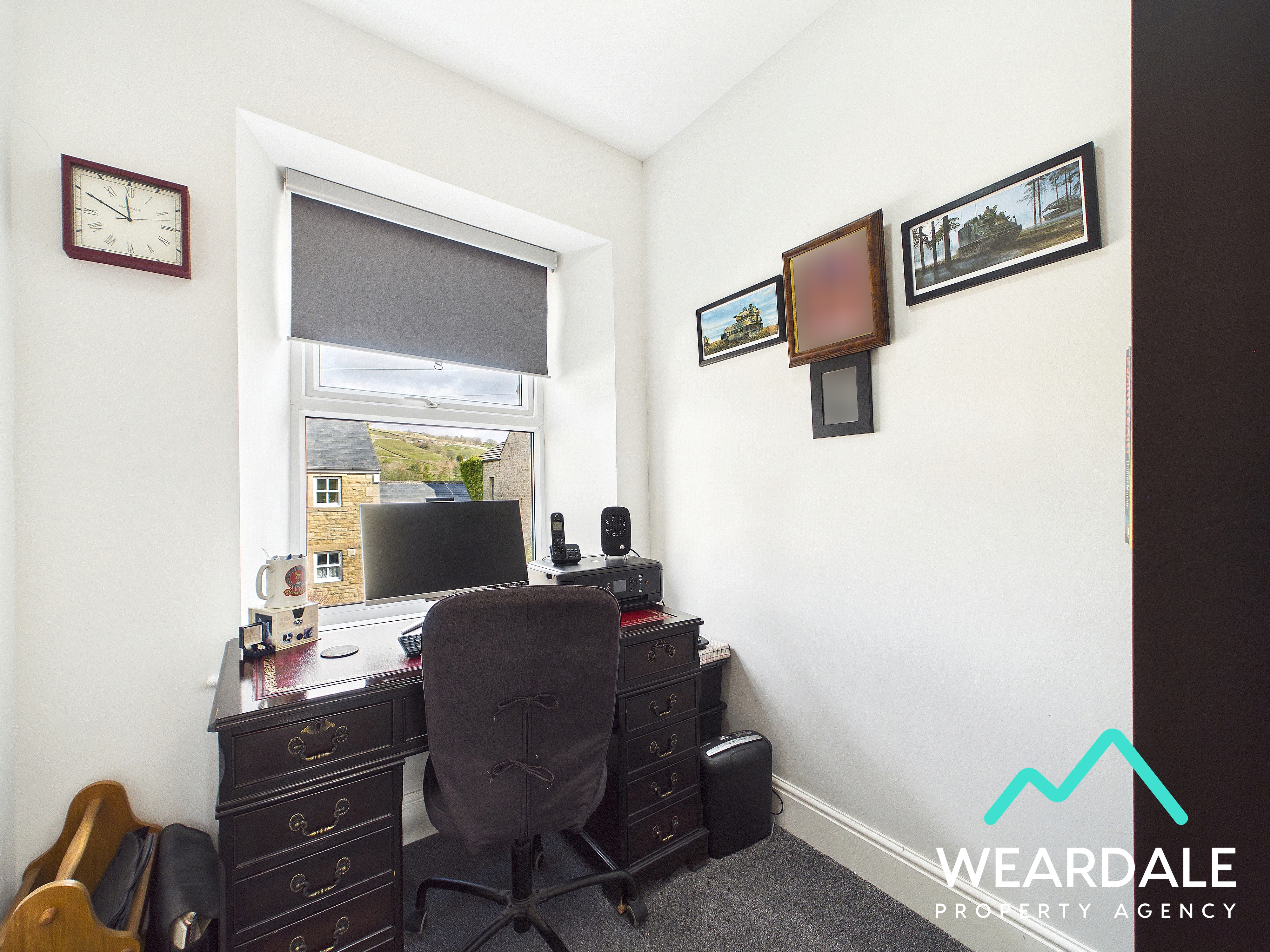 - Positioned to the front of the property and accessed from the landing - Small single room currently configured as an office - Double-glazed uPVC window with deep wooden sill to the Northern aspect, looking over the front of the property and providing lovely views of the surrounding hillsides - Carpeted - Neutrally decorated - Central ceiling light fitting - Radiator - Access hatch to the property’s roof space, which has a pull-down ladder, is fully boarded, and is equipped with power and lighting