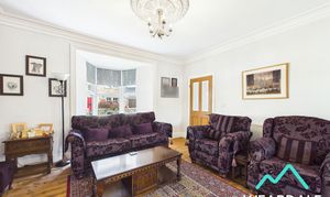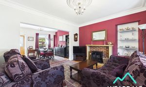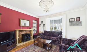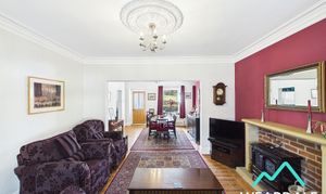 - Positioned to the front of the property, accessed from the entrance hallway, and being open-plan (4.12m x 7.39m) with the dining room - Spacious lounge area - Double-glazed uPVC bay window to the Northern aspect, looking over the front garden - Original wood flooring - Neutrally decorated - Alcove with built-in shelving to the Western wall - Traditional coving and ceiling rose - Fireplace set on a stone hearth with exposed brick surround and stone mantle - Central ceiling light fitting - Two radiators - Space for lounge furniture