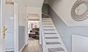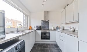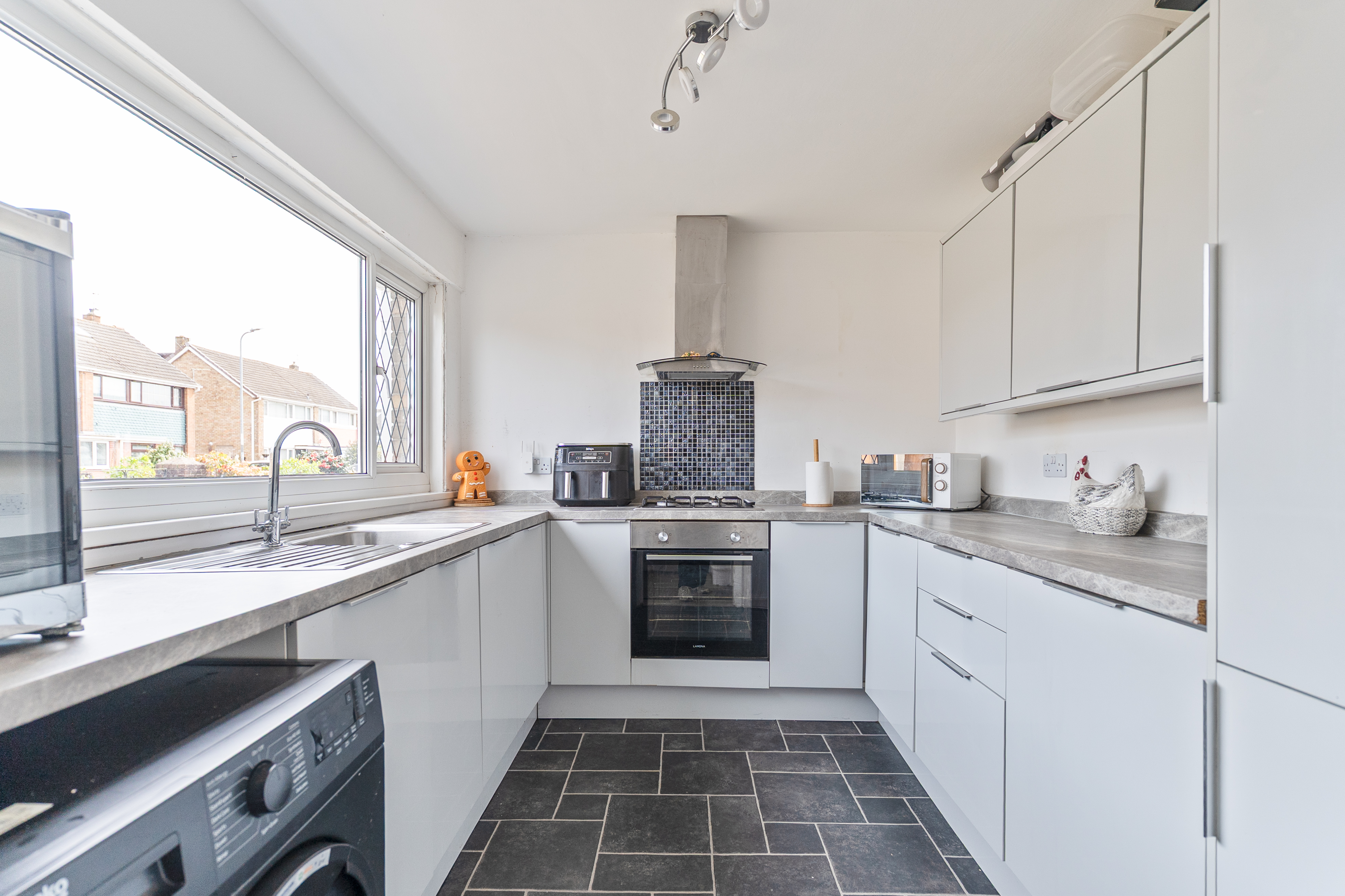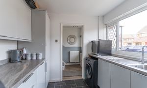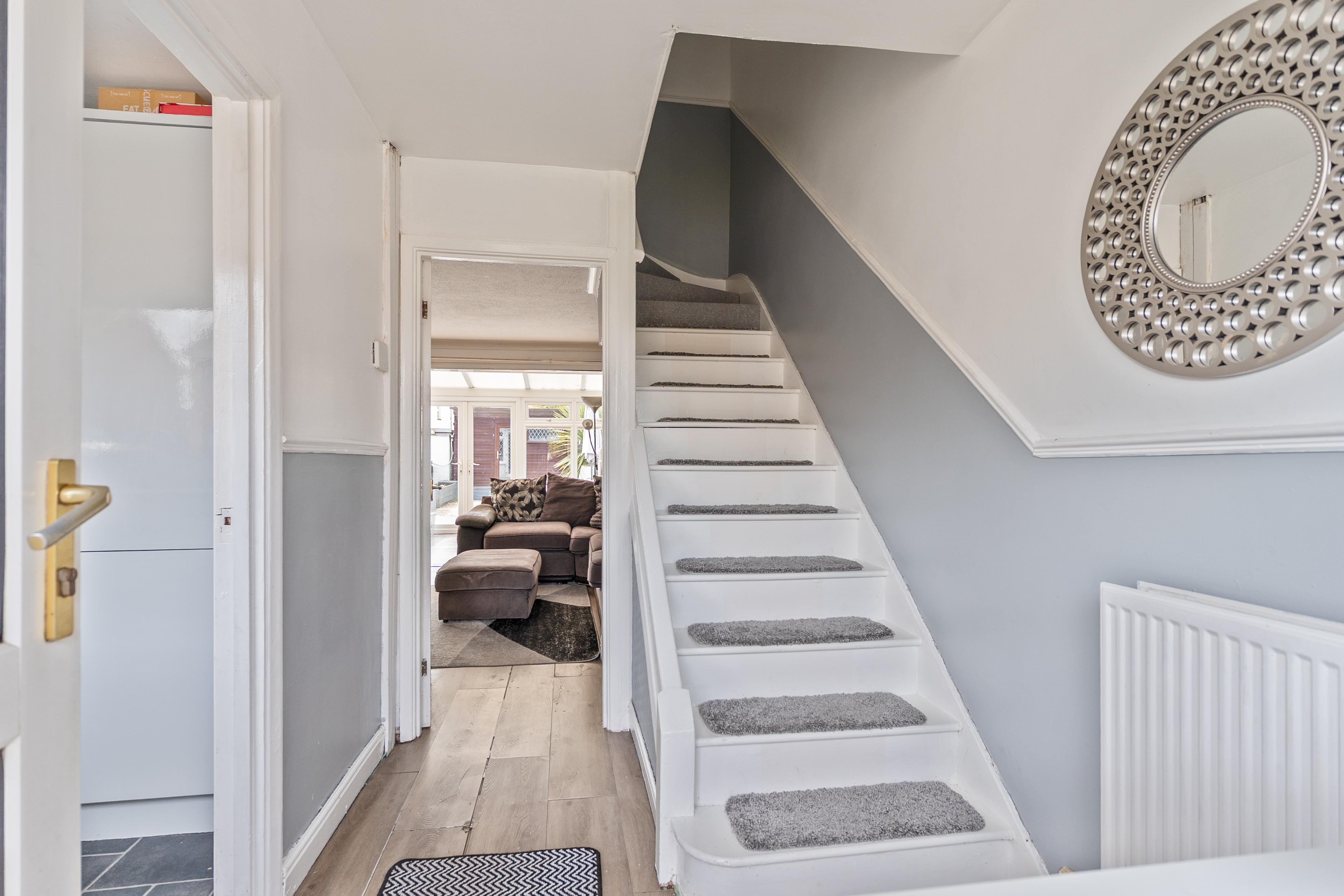 You enter the property through the hallway, which provides access to the main ground floor rooms and the staircase leading to the first floor. To the left is the modern fitted kitchen, offering ample storage and workspace, with plenty of natural light from the large front-facing window. To the rear is the main living area, a spacious lounge with open plan access into the conservatory, creating a bright and versatile space with plenty of room for both seating and dining.