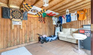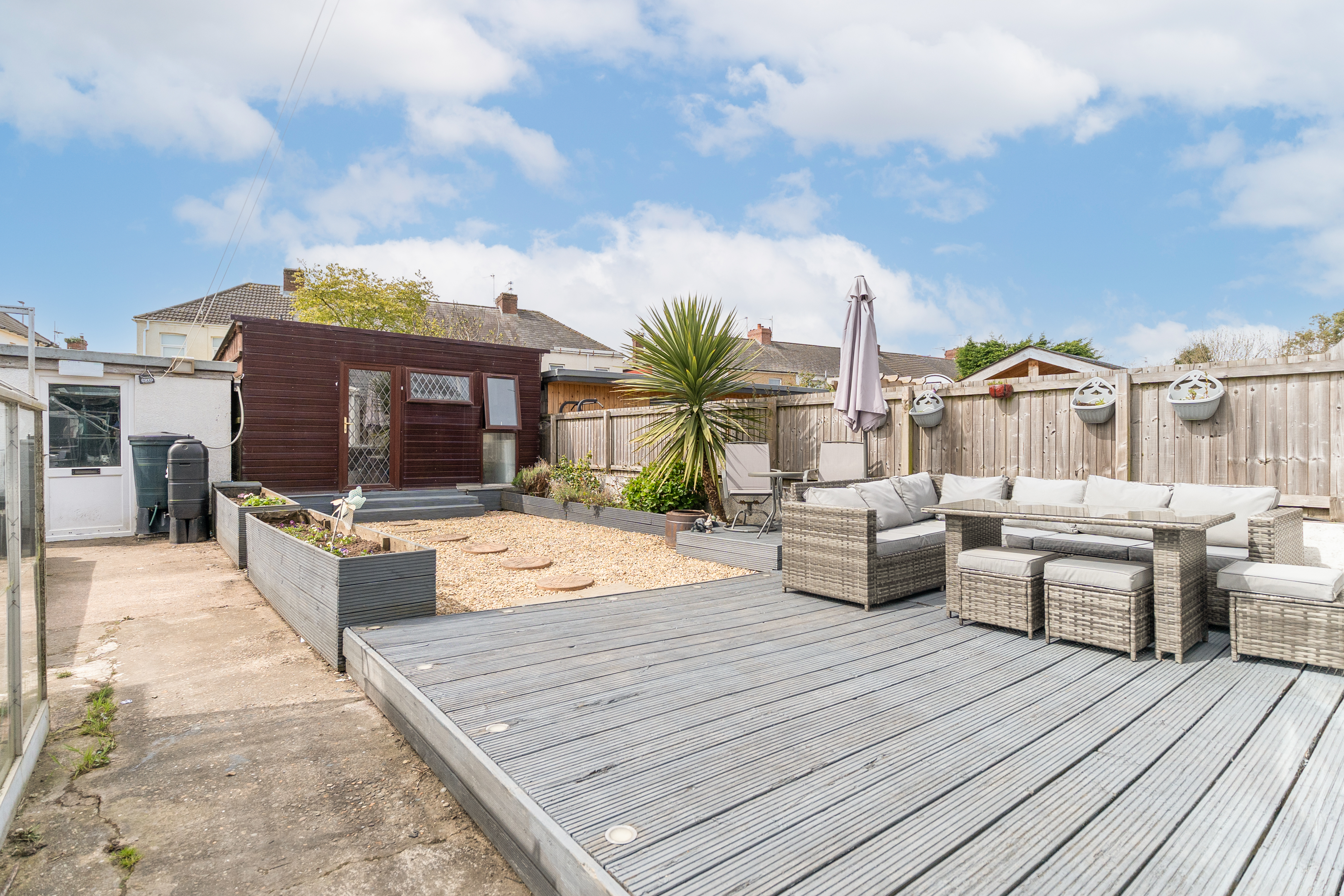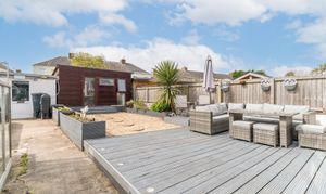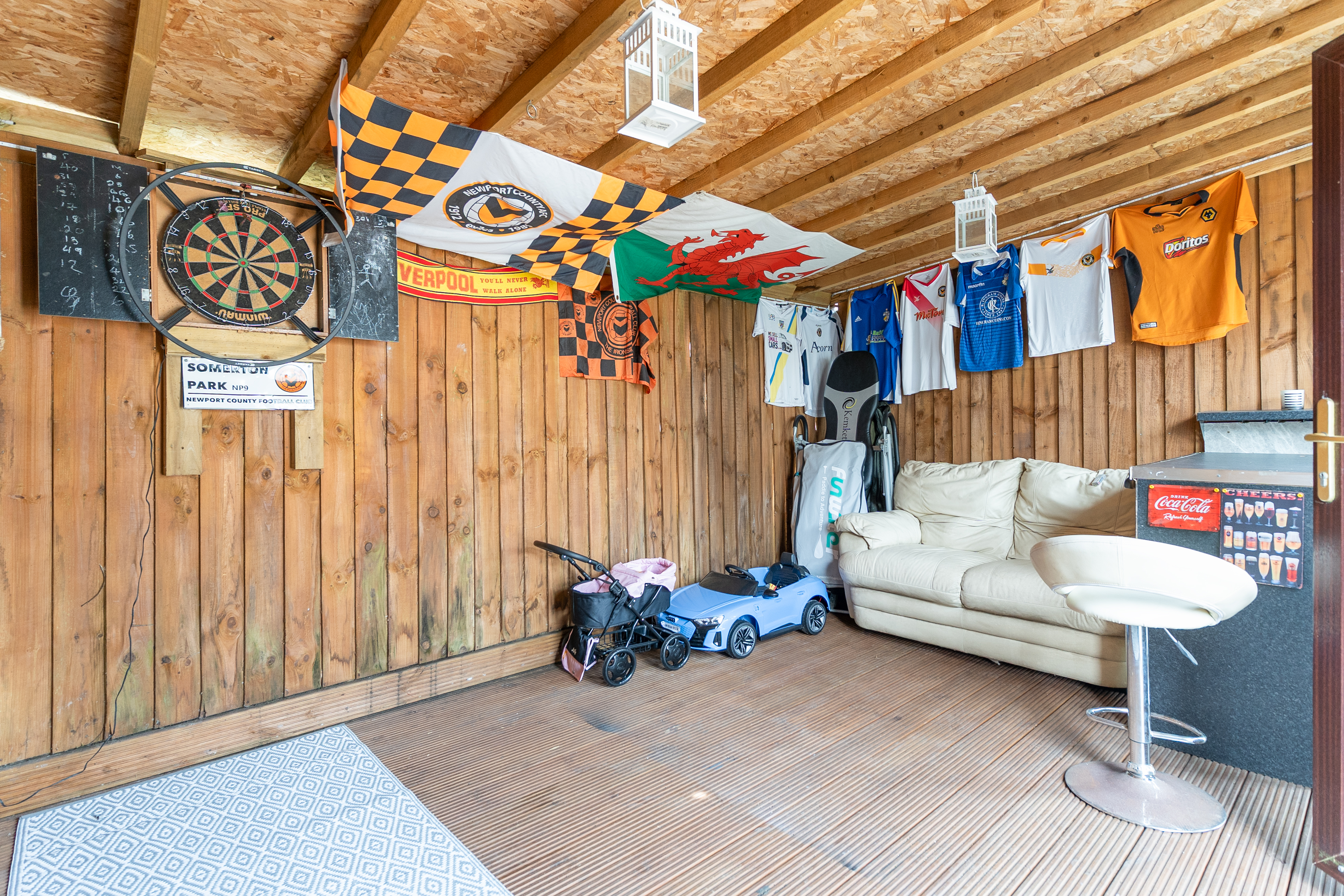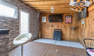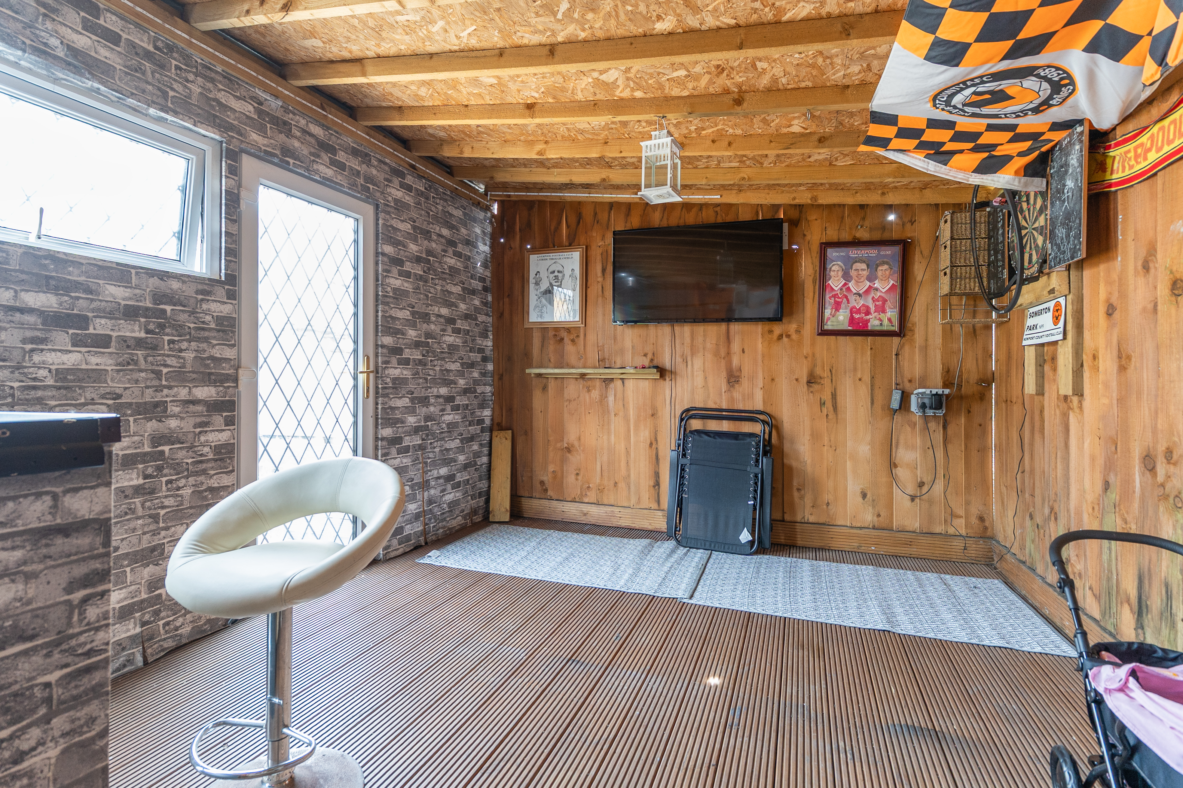 To the front of the property is a driveway, providing off-road parking. To the rear is a larger than average garden, featuring multiple seating areas and a summer house/home bar, creating an ideal outdoor space for relaxing and entertaining.