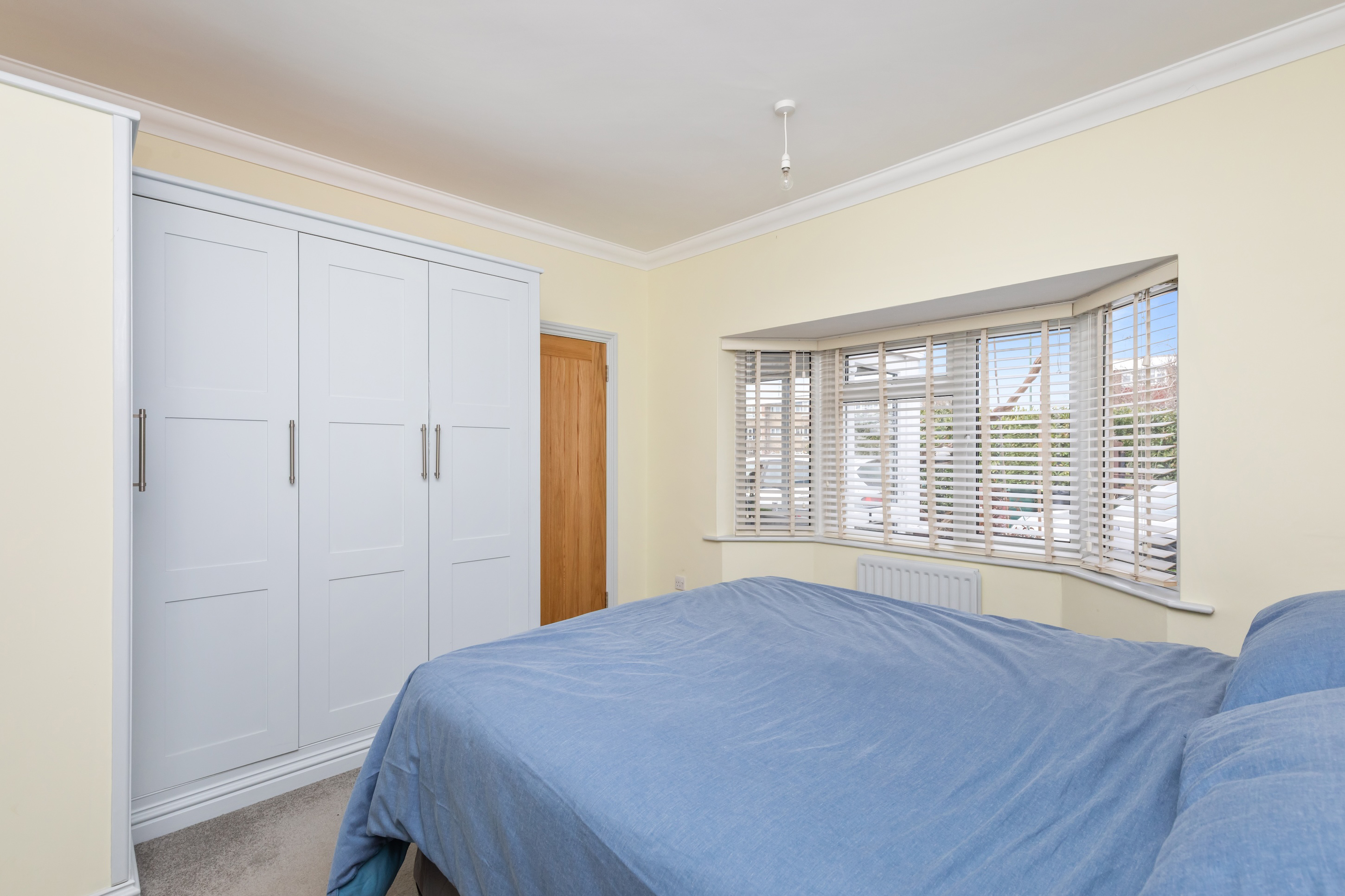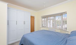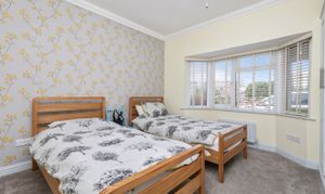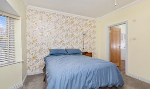 Upon entering, you are welcomed by a generous porch leading into the central hallway. The principal bedroom is particularly noteworthy, featuring a large bay window, fitted wardrobes, and its own en-suite bathroom. Adjacent is a second double bedroom of equally impressive proportions. The third double bedroom is accessed from the hallway and is positioned opposite the family bathroom.