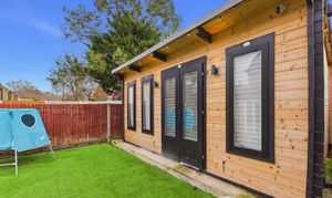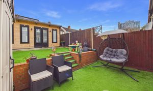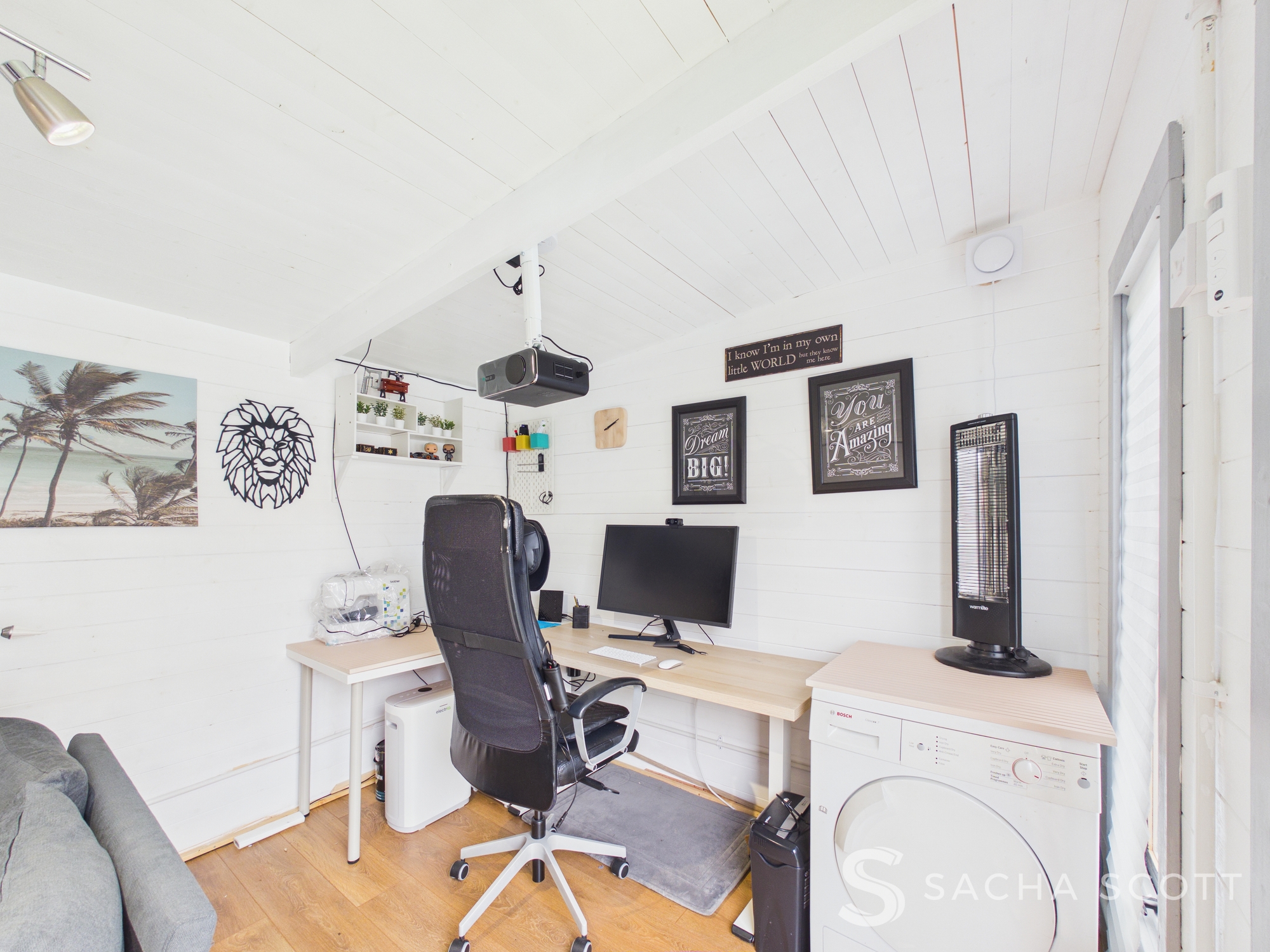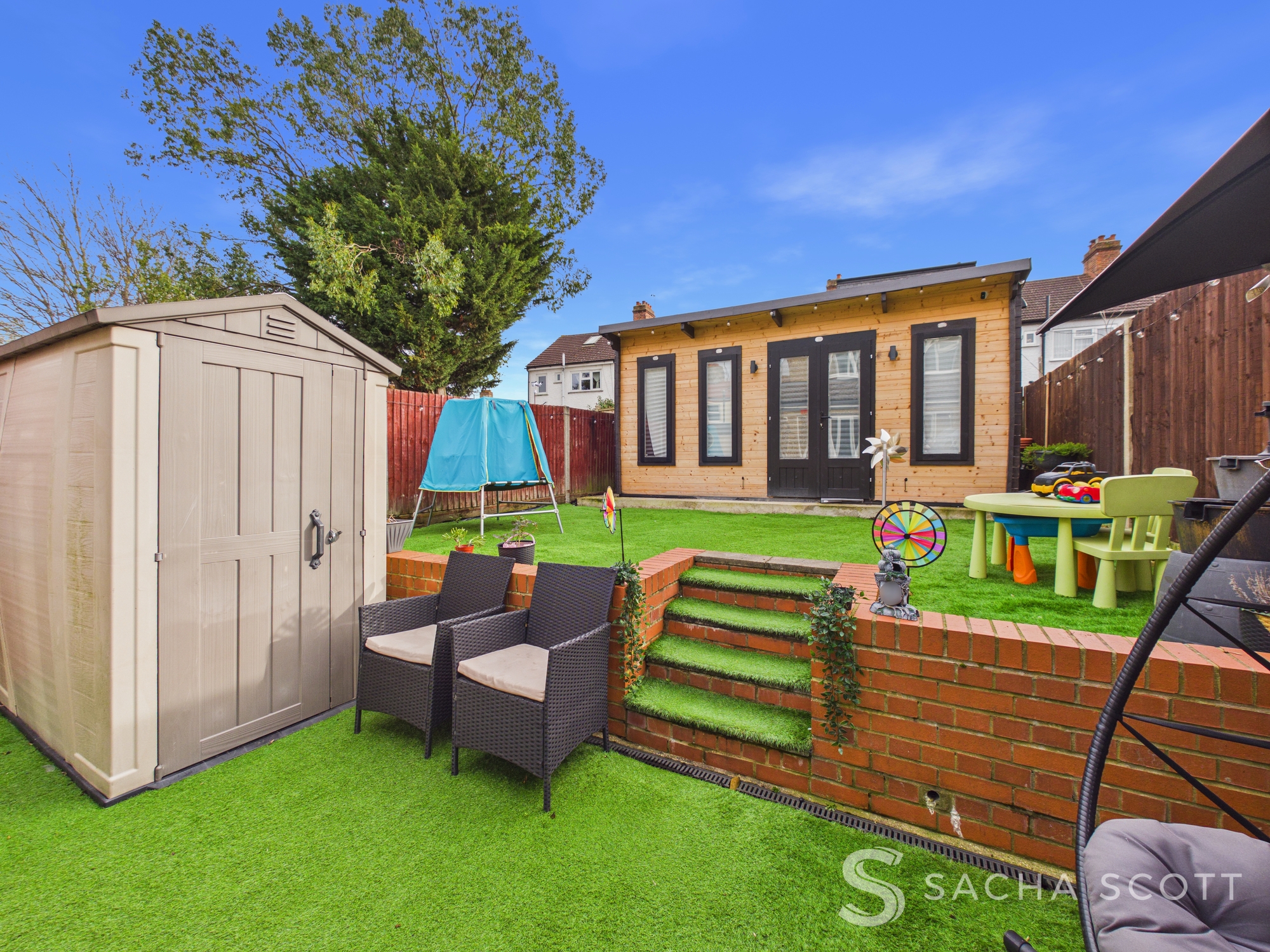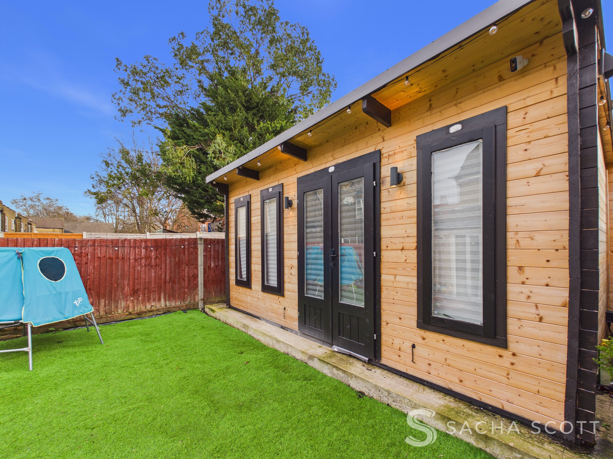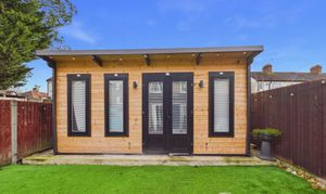 The low maintenance garden is south east facing measuring approximately 35ft x 20ft over two elevations, divided by a retaining wall with a recently installed log cabin with electrics and external lighting on the upper level with the garden furniture occupying the lower level with garden tap, lighting and a side access area with plenty of storage space.