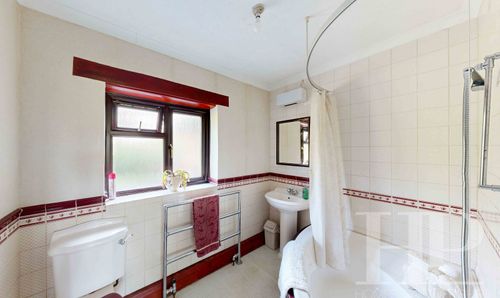 Fitted with a white suite comprising a corner bath with a shower over, a wash hand basin, and a low-level WC. Heated towel rail. Opaque window to the rear.
